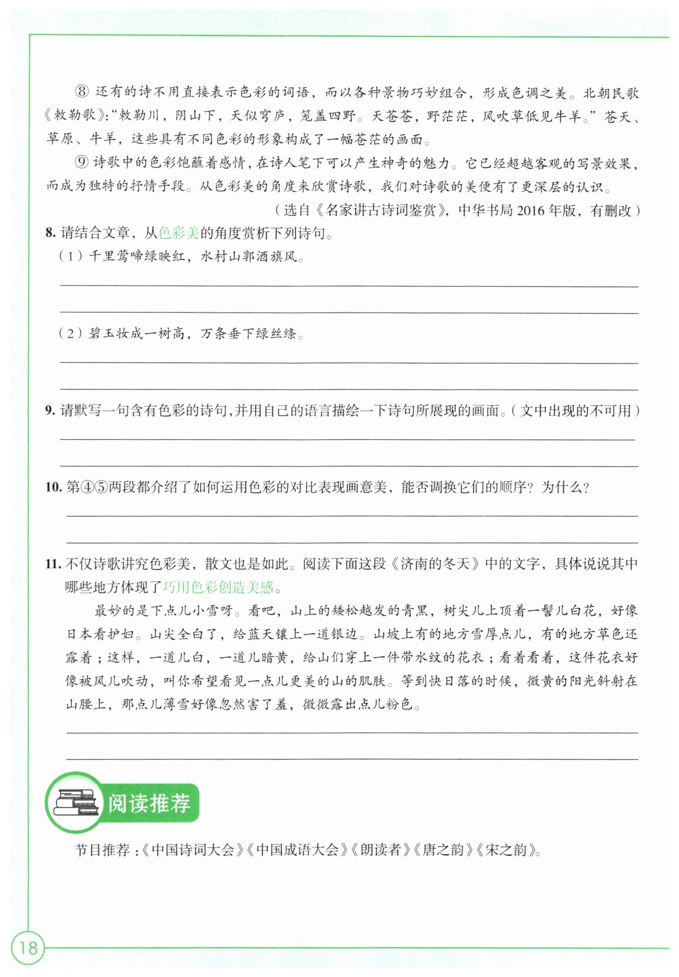 對比。②“山尖全白了,給藍天鑲上一道銀邊”,這句追求單一色調深淺濃淡的變化之美,雪后的小山和天空融為一體,雪色使天空的藍色也發(fā)生了變化。 ③“有的地方雪厚點兒,有的地方草色還露著;這樣,一道兒白,一道兒暗黃,給山們穿上一件帶水紋的花衣”,這句運用多種色彩的組合,寫出了雪后的小山美妙的姿態(tài)。(意思對即可)