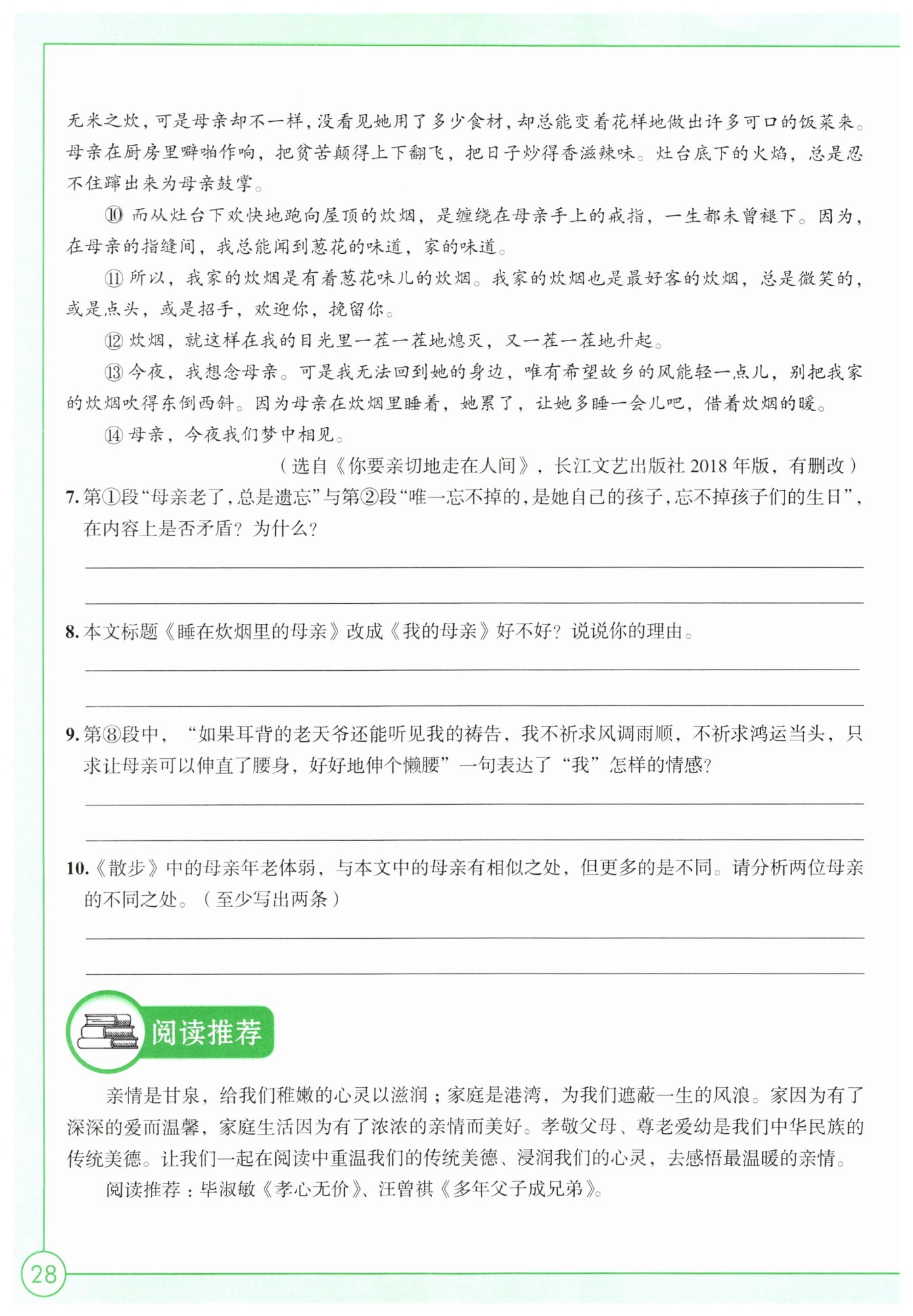 做飯、洗衣服、縫扣子,做各種家務(wù)活。②《散步》中的母親與兒孫其樂(lè)融融、共享天倫;本文中的母親很孤獨(dú),一直在掛念著遠(yuǎn)行的孩子。