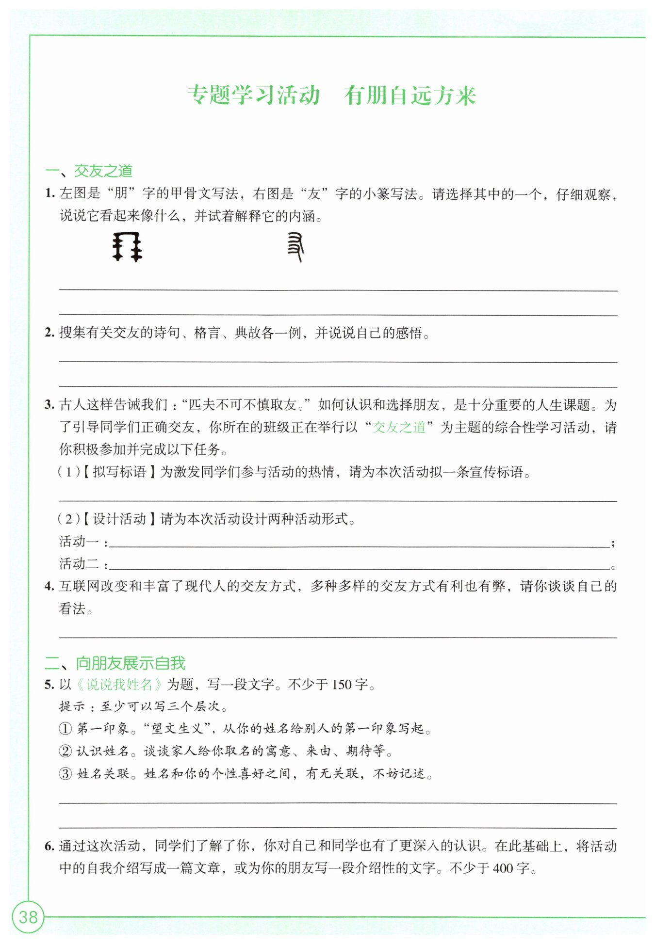【解析】:本題是一道語(yǔ)文寫(xiě)作題,屬于七年級(jí)人教版上冊(cè)的專(zhuān)題學(xué)習(xí)活動(dòng)“有朋自遠(yuǎn)方來(lái)”中的一部分。題目要求基于活動(dòng)中的自我介紹或?yàn)榕笥褜?xiě)一段介紹性的文字,并要求字?jǐn)?shù)不少于400字。這主要考查學(xué)生的文字表達(dá)能力、語(yǔ)言組織能力以及對(duì)人物特征的捕捉和描述能力。