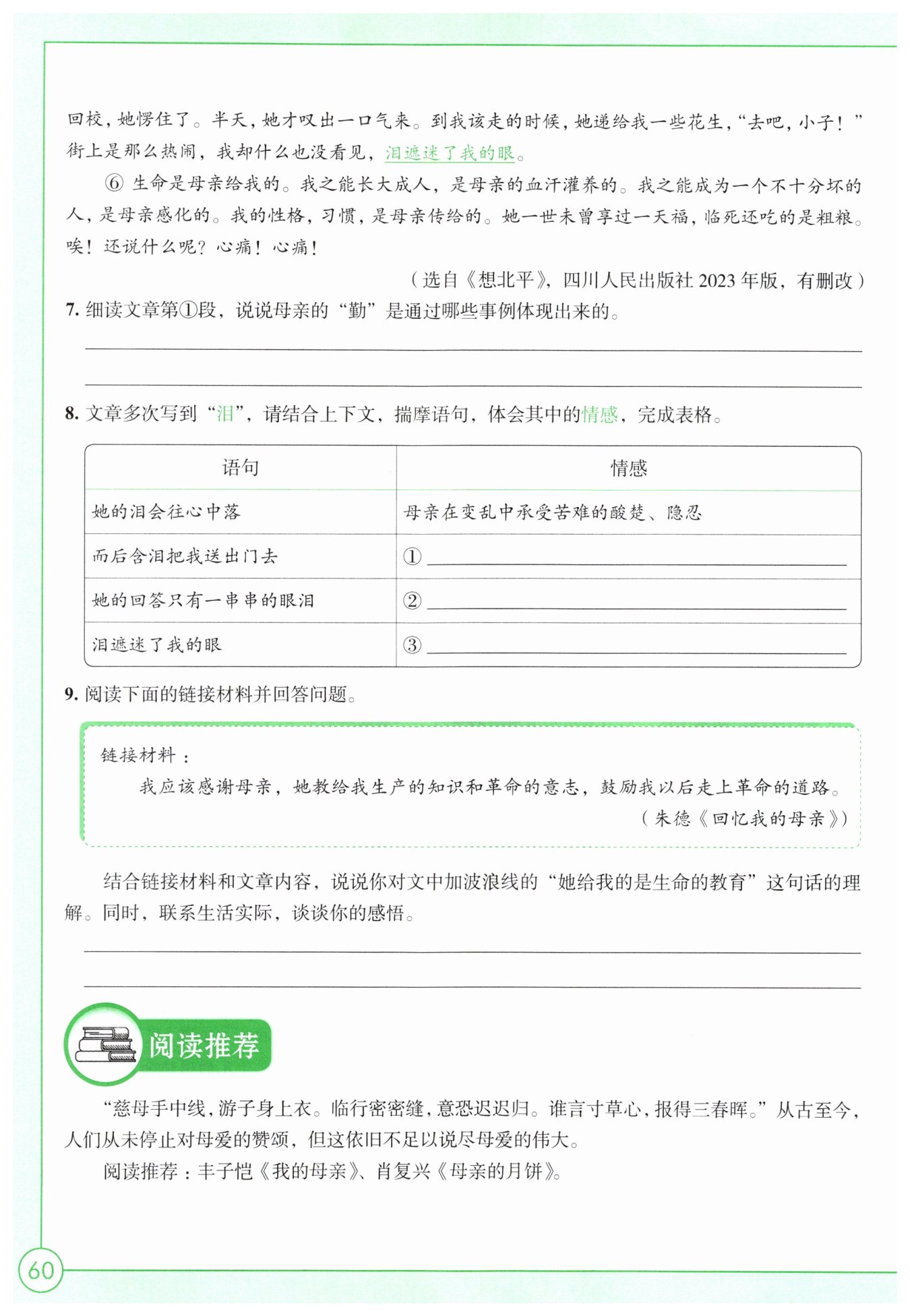 理解:母親不僅養(yǎng)育了“我”,而且影響了“我”的習(xí)慣、個性、精神,影響了“我”的一生。 感悟:父
