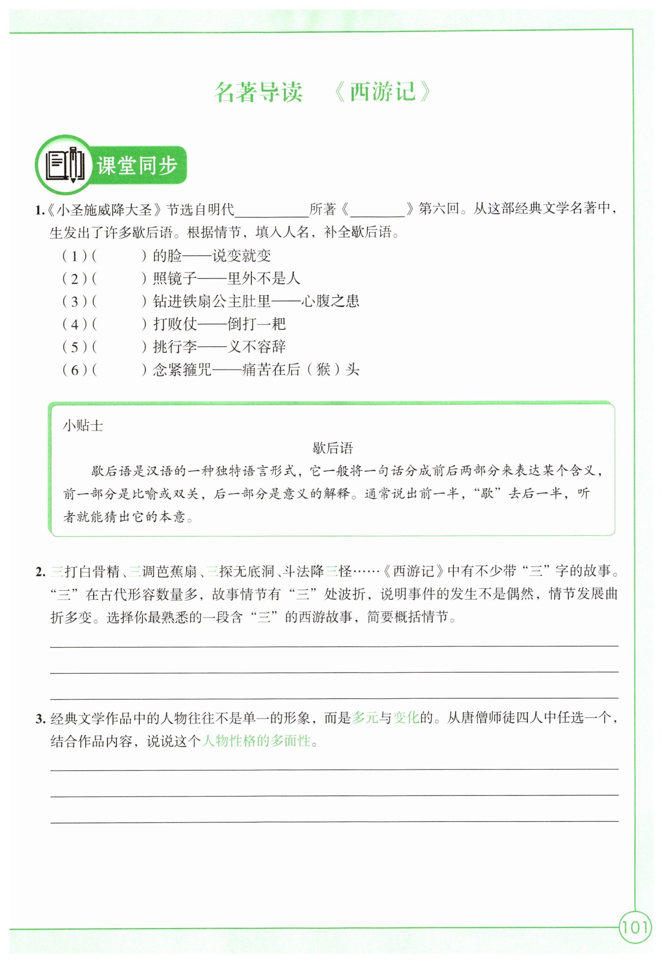 [示例]唐僧:一方面他心地善良,嚴(yán)守戒律,目標(biāo)明確;另一方面他愚善固執(zhí),好壞不辨,欠缺應(yīng)變能力。孫悟空:一方面他敢作敢當(dāng),敢于反抗壓迫,勇敢機智;另一方面他桀驁不馴,性格急躁。 八戒:一方面他性格溫和,對師父忠心耿耿;另一方面他好吃懶做,愛占小便宜,貪圖女色。 沙僧:一方面他憨厚老實、任勞任怨;另一方面他一味聽從命令,循規(guī)蹈矩,缺少主見。