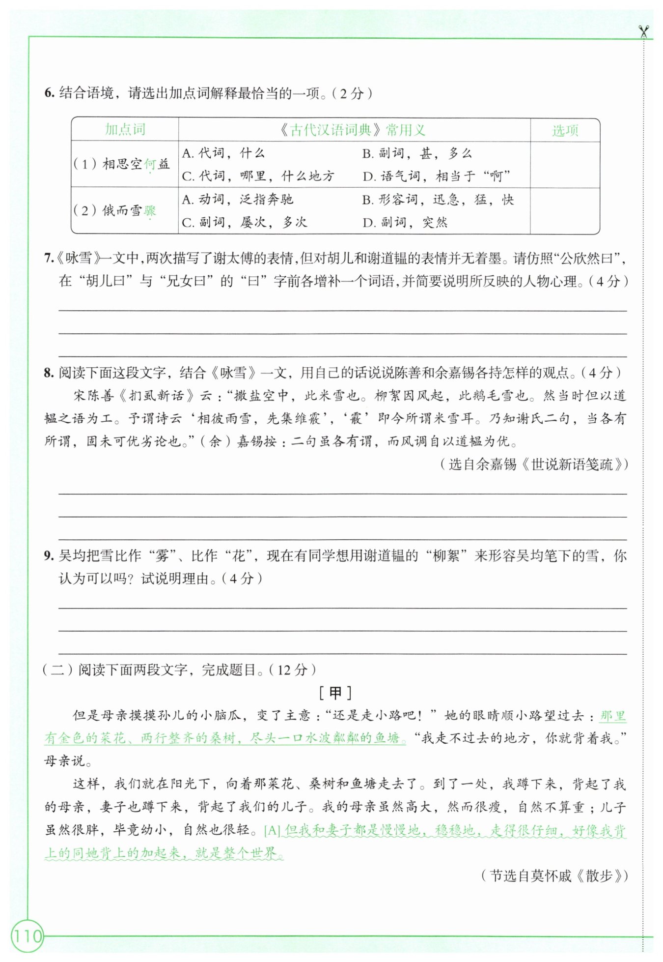 [示例三]不可以。吳詩第四句說“凝階似花積”,可見雪花凝結在臺階上,而柳絮是隨風飛舞的,它不會凝固不動。[示例四]可以。吳詩第三句“縈空如霧轉”,描寫了雪花在空中縈繞、飄動,一片迷蒙,這正如柳絮在空中飄舞,白茫茫一片。[示例五]可以。吳詩第二句中“細雪”二字,可見雪并不大,用“柳絮”形容,能寫出雪花姿態(tài)的輕盈。