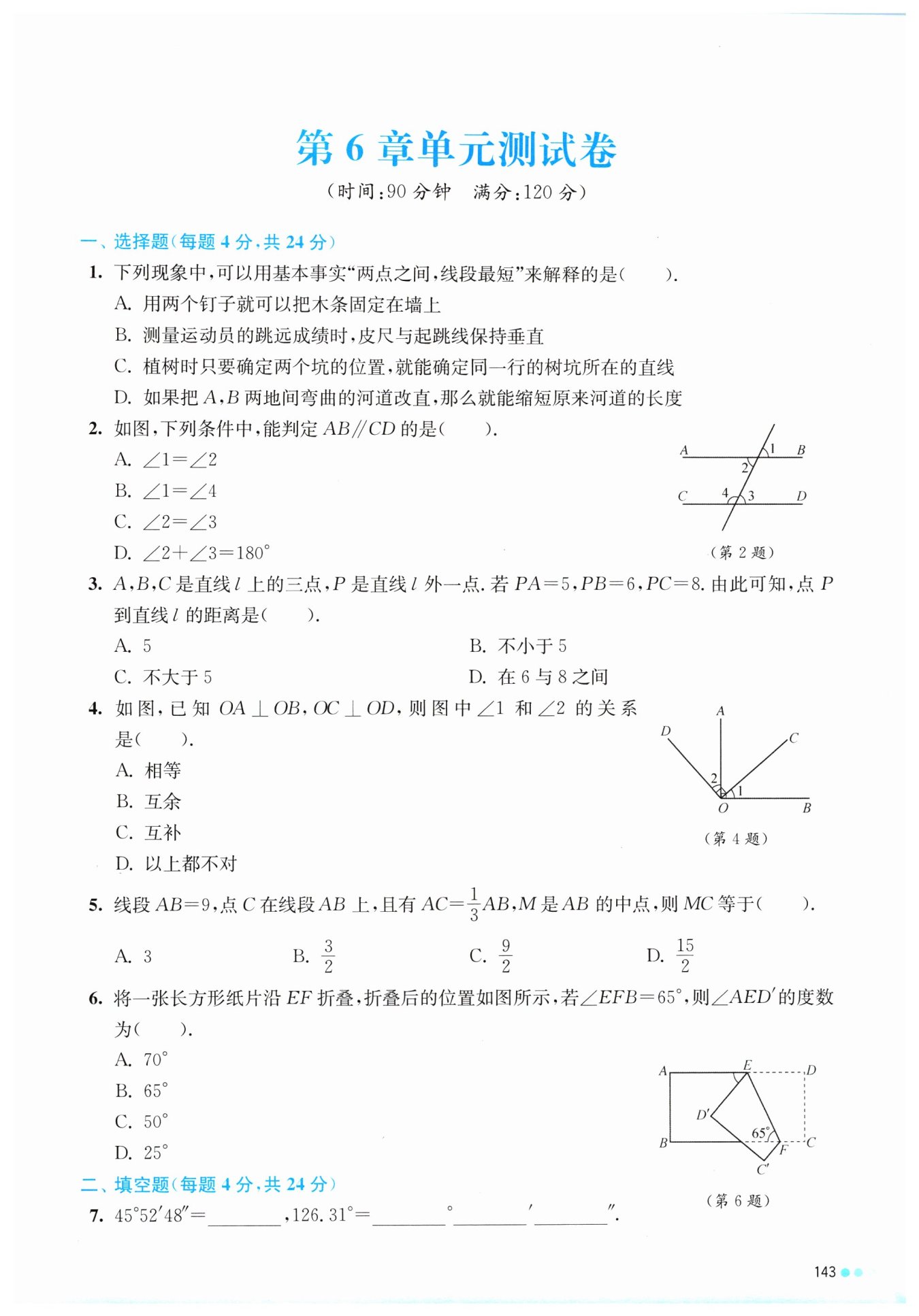 選項C:植樹時只要確定兩個坑的位置,就能確定同一行的樹坑所在的直線,這是利用了“兩點確定一條直線”的原理,與“兩點之間,線段最短”無關(guān),所以C選項錯誤;