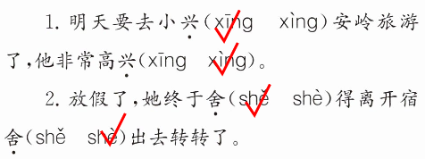 2. 舍(shě√ shè)得 宿舍(shě shè√)