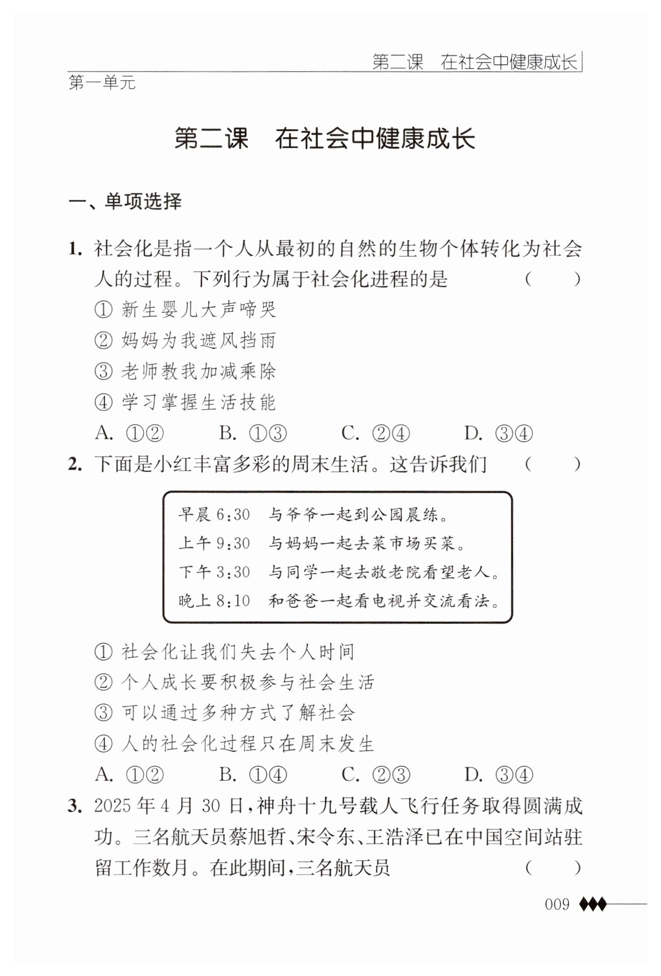 本題是一個選擇題,旨在考查對社會化進(jìn)程的理解。社會化是指一個人從自然的生物個體逐漸轉(zhuǎn)化為社會人的過程,這通常涉及學(xué)習(xí)社會規(guī)范、價值觀、行為準(zhǔn)則以及生活技能等。我們需要分析每個選項,看它們是否反映了這一過程。
