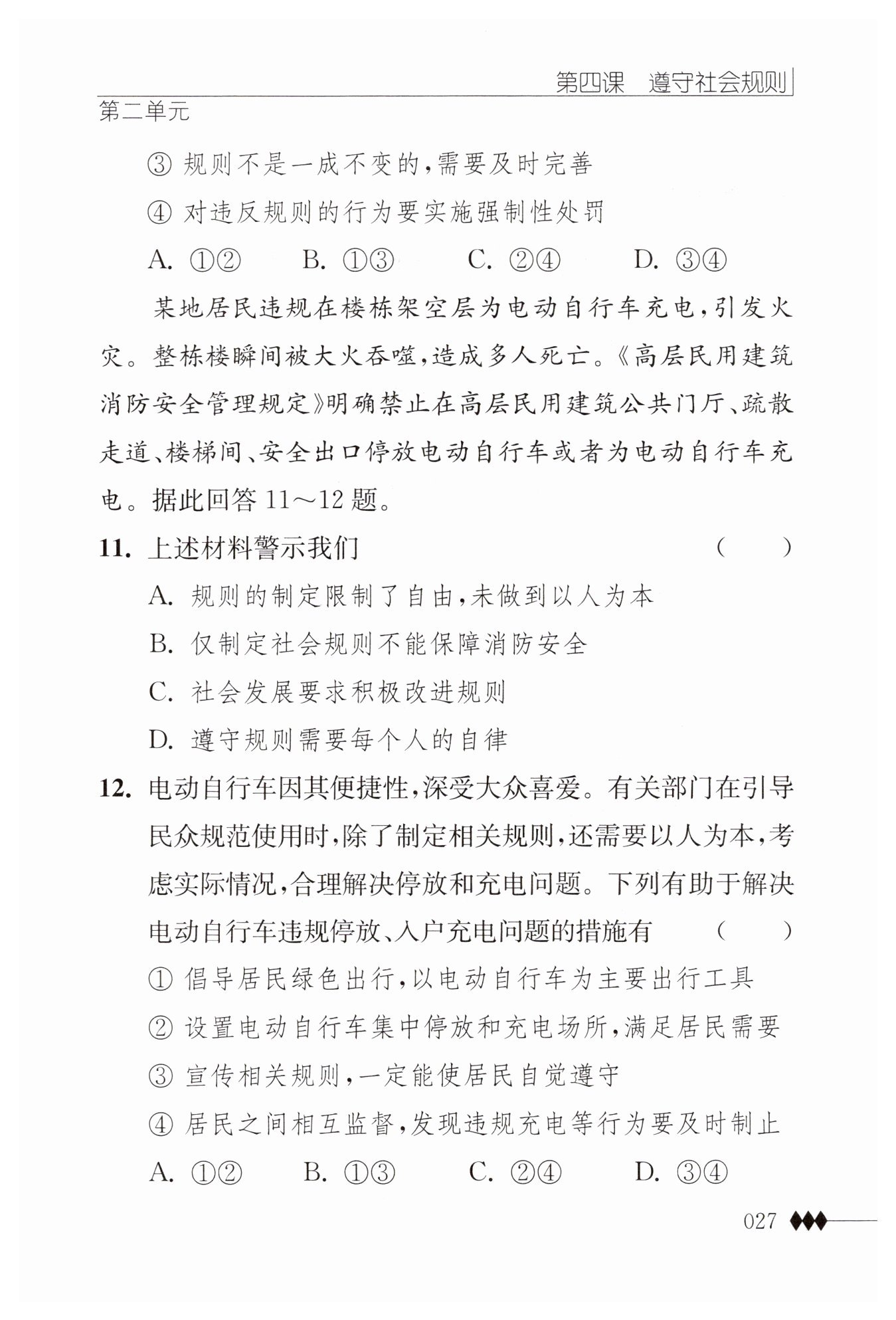 對(duì)于第11題,本題考察的是對(duì)規(guī)則與自由關(guān)系的理解,以及規(guī)則在社會(huì)發(fā)展中的作用。題干描述了由于違規(guī)在樓棟架空層為電動(dòng)自行車充電而引發(fā)的火災(zāi)事故,并指出了《高層民用建筑消防安全管理規(guī)定》中明確禁止的行為。