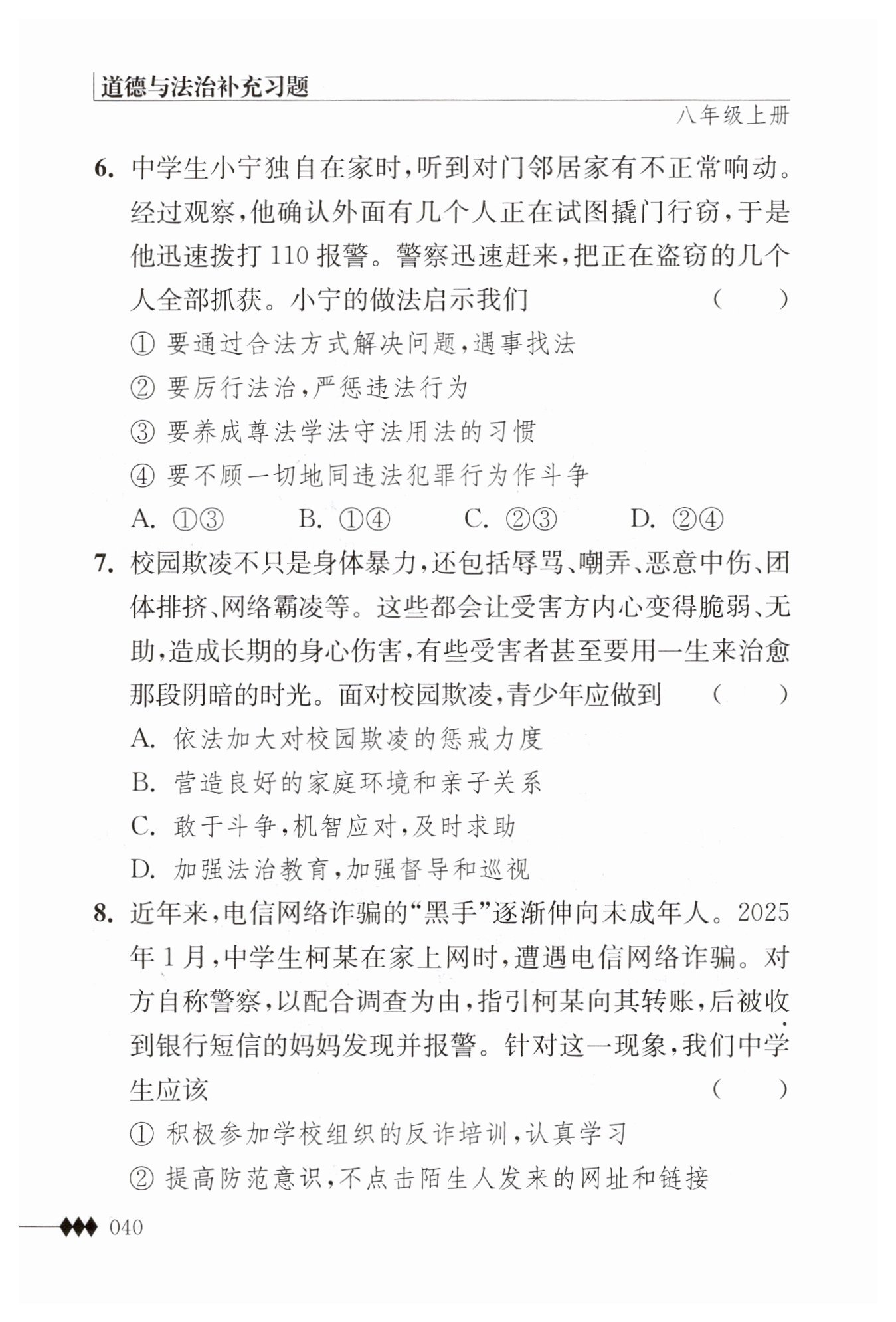 ④“要不顧一切地同違法犯罪行為作斗爭”:這個選項雖然表現(xiàn)出了一種勇敢的態(tài)度,但“不顧一切”可能會帶來不必要的風(fēng)險,尤其是對于中學(xué)生來說,他們更應(yīng)該學(xué)會在保護自己的前提下與違法犯罪行為作斗爭。