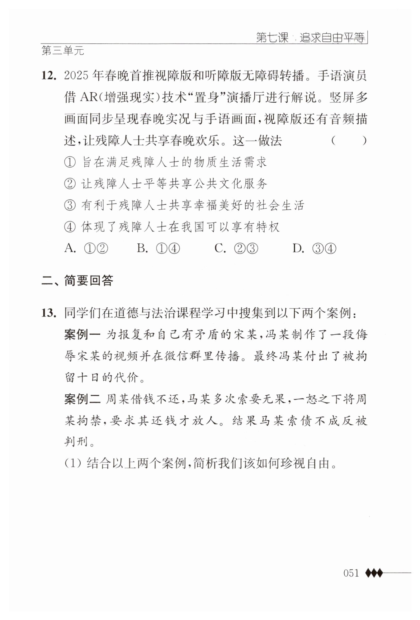 本題考查的是對平等、公平以及社會公共服務(wù)理念的理解。題目描述了2025年春晚針對殘障人士推出的無障礙轉(zhuǎn)播措施,包括視障版和聽障版的轉(zhuǎn)播,以及使用AR技術(shù)進行手語解說等,旨在讓殘障人士也能享受到春晚的歡樂。