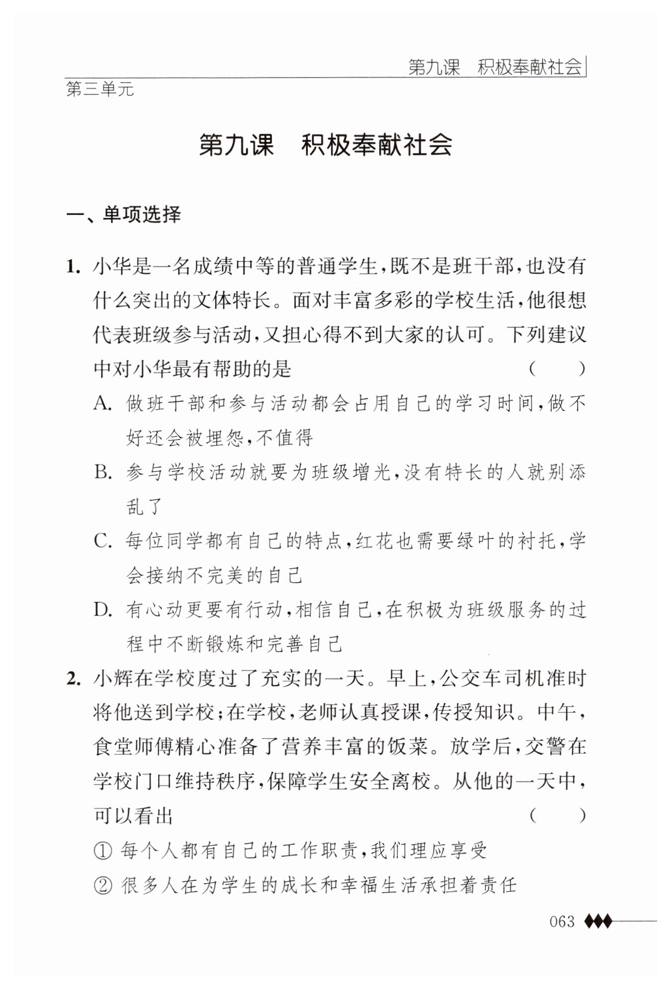 A選項(xiàng),提到做班干部和參與活動(dòng)會(huì)占用學(xué)習(xí)時(shí)間,且可能得不到認(rèn)可,這是一種消極的態(tài)度,不利于小華的成長和參與班級(jí)活動(dòng)。