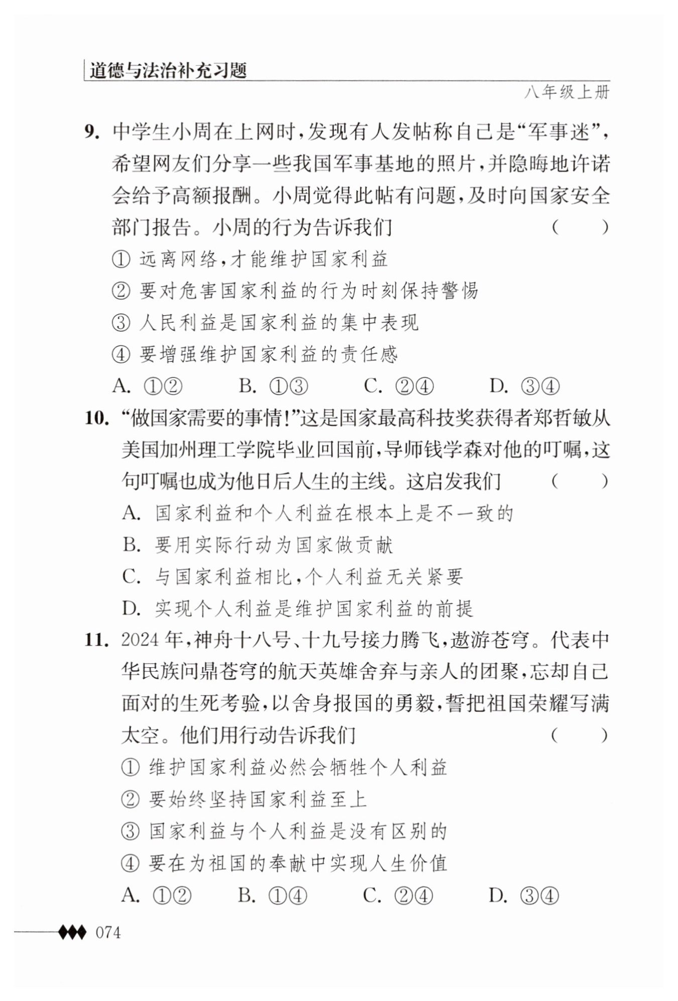 最后是選項④,“要增強(qiáng)維護(hù)國家利益的責(zé)任感”。小周的行為體現(xiàn)了這種責(zé)任感,他發(fā)現(xiàn)問題后沒有選擇忽視,而是積極向國家安全部門報告。