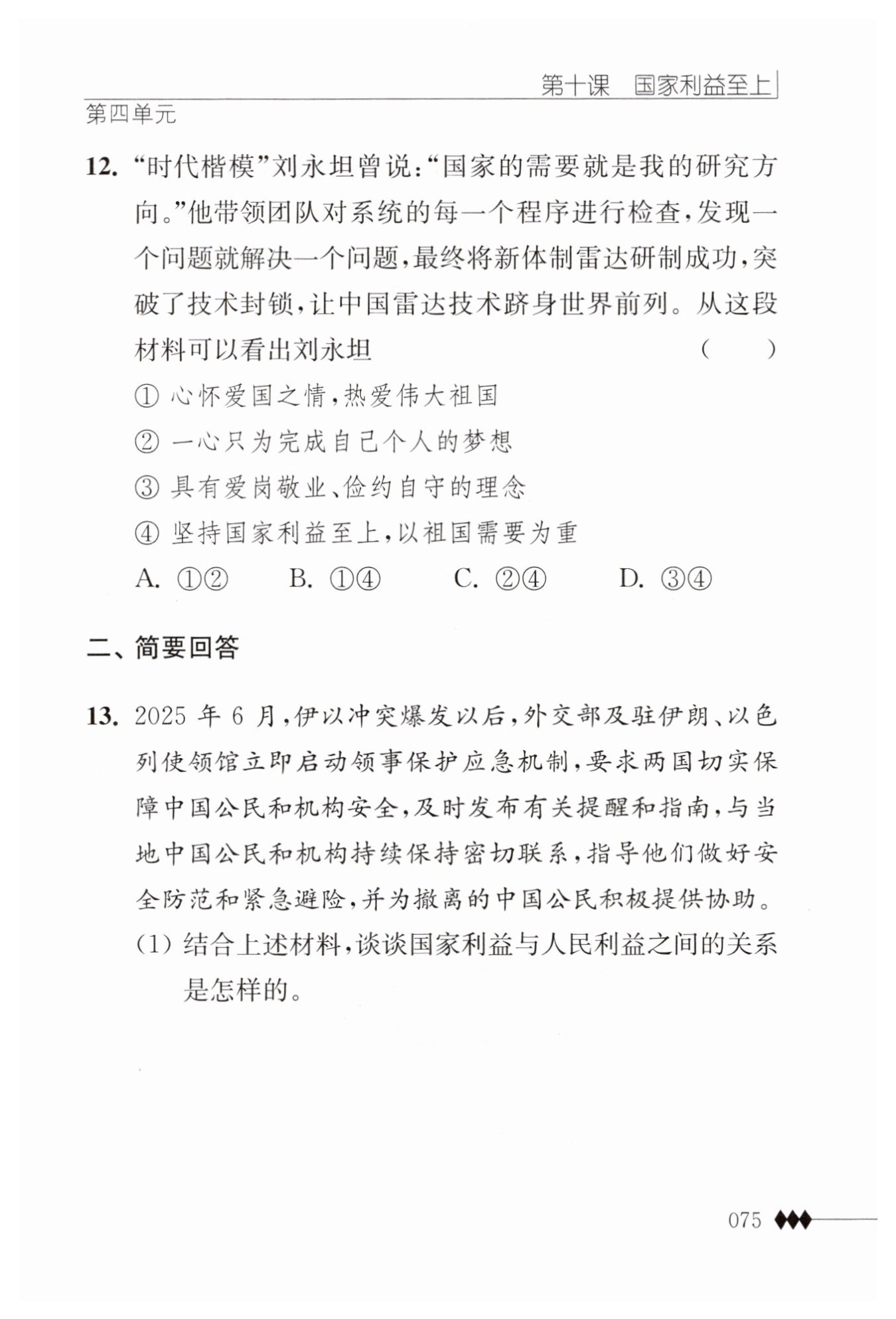 ④“堅持國家利益至上,以祖國需要為重”:這與材料中劉永坦的行為完全吻合,他始終以國家需要為研究方向,體現(xiàn)了國家利益至上的原則。