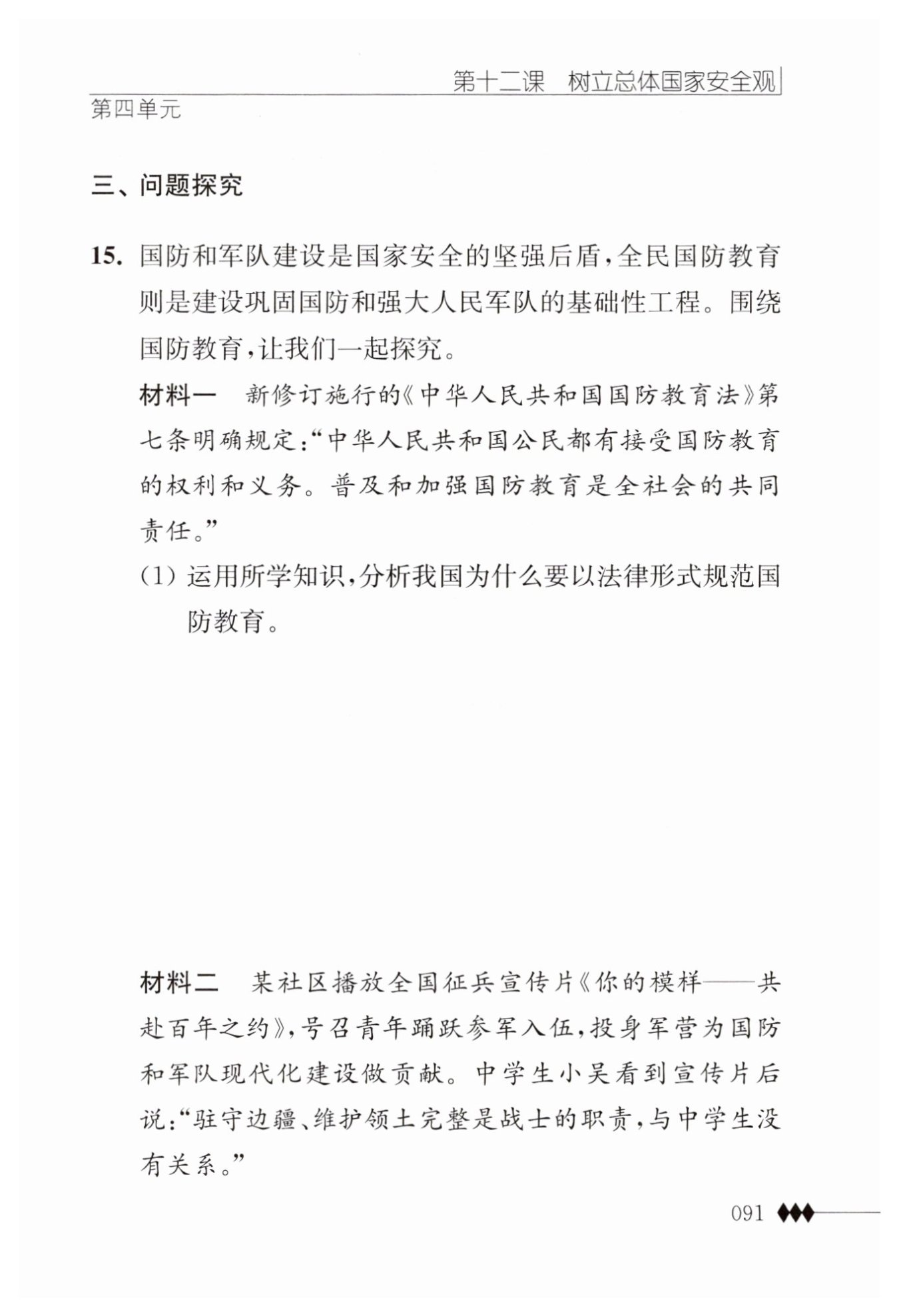 ②國家安全是國家生存與發(fā)展的重要保障,是人民幸福安康的前提,國防教育有助于增強公民國家安全意識,法律形式能強化公民接受國防教育的權(quán)利和義務(wù)觀念。