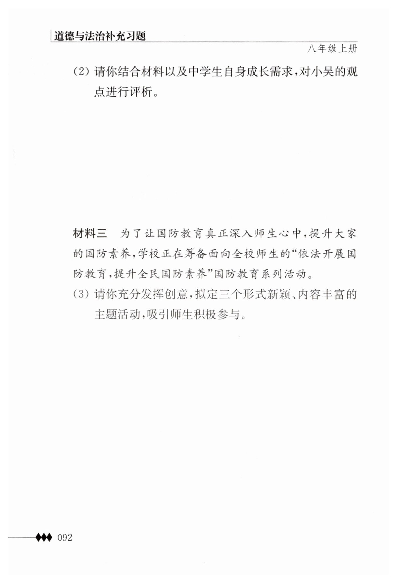 ③材料中《國防教育法》規(guī)定公民有接受國防教育的權(quán)利和義務(wù),中學(xué)生應(yīng)積極參與國防教育,樹立“國家興亡,匹夫有責(zé)”的意識,為維護(hù)領(lǐng)土完整和國家安全貢獻(xiàn)力量。