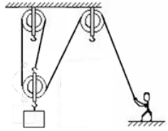 設(shè)計(jì)圖:由2個定滑輪和2個動滑輪組成的滑輪組,繩子從動滑輪開始繞,共4股繩子承擔(dān)物重($n=4$)。