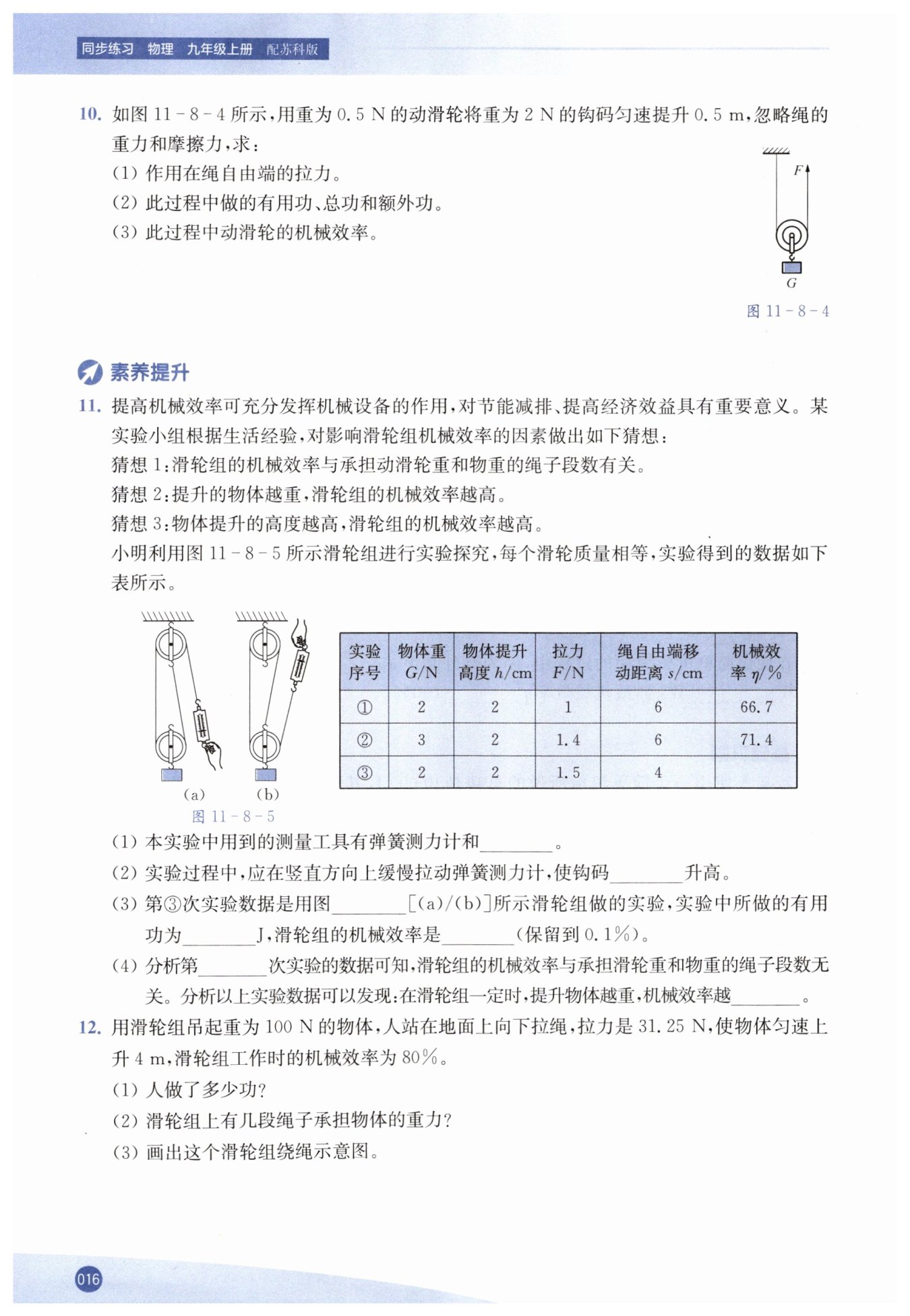 (3)動(dòng)滑輪的機(jī)械效率:$\eta=\frac{W_{有用}}{W_{總}(cāng)}\times100\%=\frac{1\ \text{J}}{1.25\ \text{J}}\times100\% = 80\%。$
