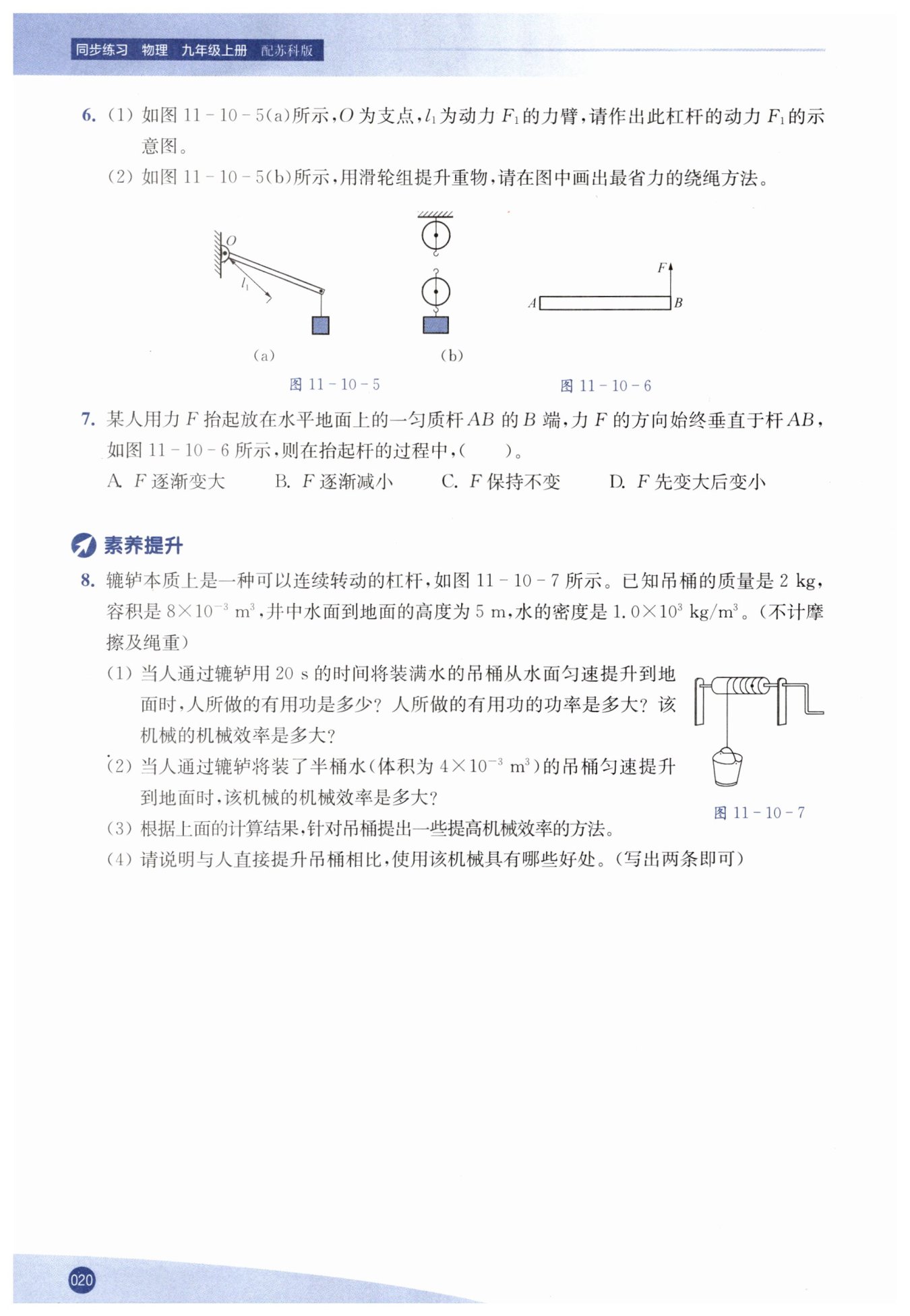 (1)滿桶水的質(zhì)量$m_{1}=\rho V=8\ kg$,人所做的有用功$W_{有用}=m_{1}gh=400\ J$ 人所做有用功的功率$P_{有用}=\frac{W_{有用}}{t}=\frac{400\ J}{20\ s}=20\ W$ 提升吊桶所做總功$W_{總}=Fh=(m_{1}+m_{2})gh=500\ J$,機(jī)械效率$\eta=\frac{W_{有用}}{W_{總}}×100\% =80\%$ (2)半桶水的質(zhì)量$m_{1}'=\rho V'=4\ kg$,有用功$W_{有用}'=m_{1}'gh=200\ J$,總功$W_{總}'=Fh=(m_{1}'+m_{2})gh=300\ J$,機(jī)械效率$\eta'=\frac{W_{有用}'}{W_{總}'}×100\% =66.7\%$ (3)減小吊桶的質(zhì)量,增大吊桶內(nèi)水的質(zhì)量 (4)① 省力;② 可以改變施力方向;③ 安全(寫出兩條即可)