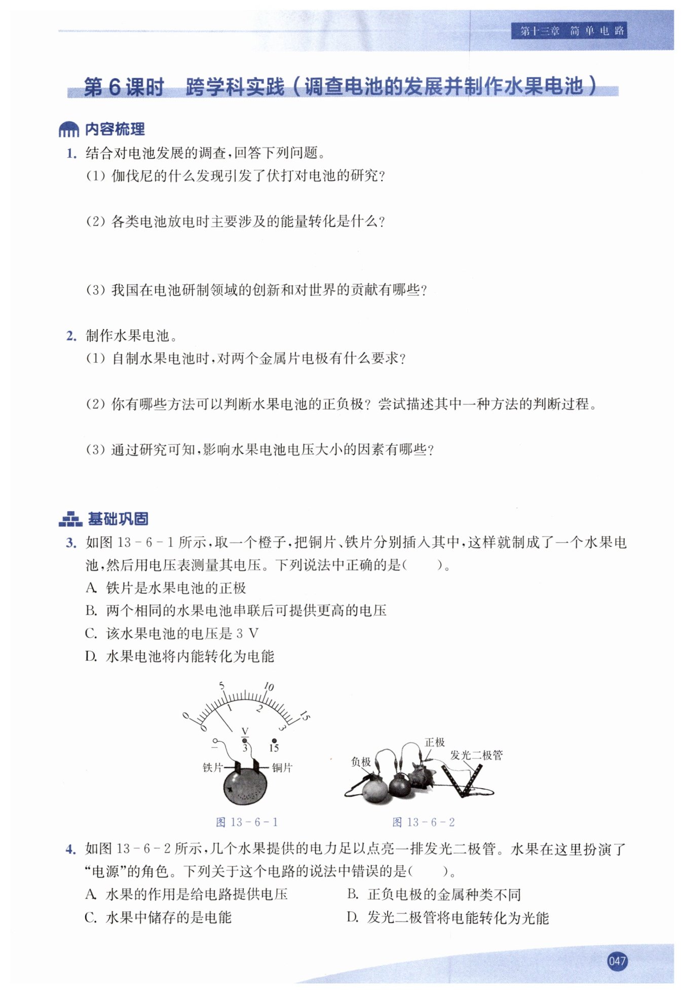 方法一:用電壓表判斷。將電壓表的正、負(fù)接線柱分別與水果電池的兩個電極相連,若電壓表指針正向偏轉(zhuǎn),則與正接線柱相連的電極為正極,與負(fù)接線柱相連的電極為負(fù)極;若指針反向偏轉(zhuǎn),則與正接線柱相連的電極為負(fù)極,與負(fù)接線柱相連的電極為正極。