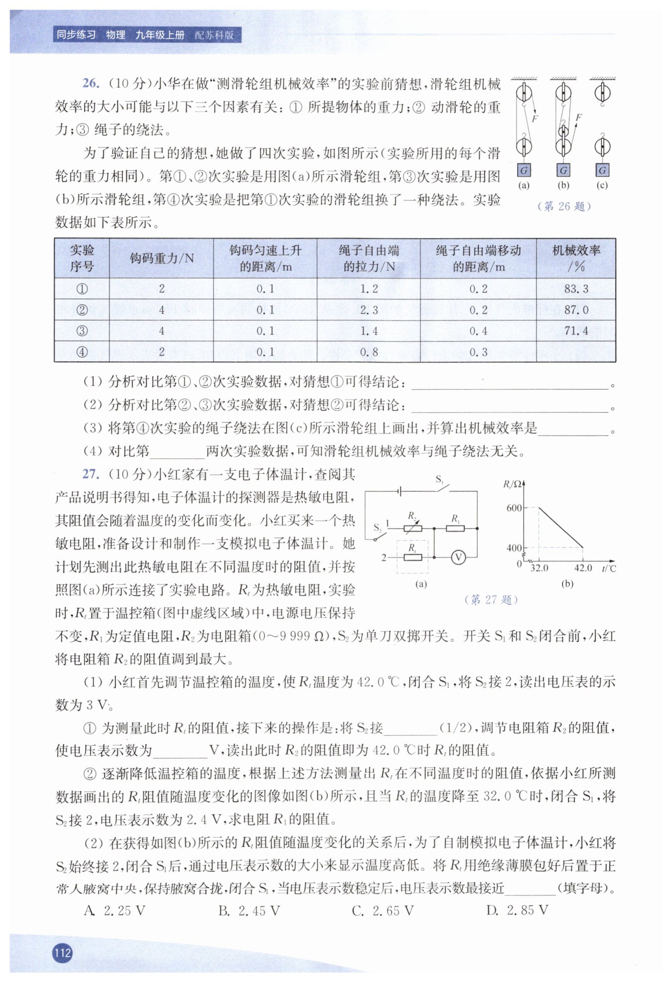(1)①1 3 ②設(shè)電源電壓為$U$,當溫度為$42.0^\circ{C}$時,$R_{t1}=400\ \Omega$,$U_{1}=3\ V$,此時電路中電流$I_{1}=\frac{U_{1}}{R_{1}}$,電源電壓$U=I_{1}(R_{t1}+R_{1})=\frac{U_{1}}{R_{1}}(R_{t1}+R_{1})$。當溫度為$32.0^\circ{C}$時,$R_{t2}=600\ \Omega$,$U_{2}=2.4\ V$,此時電路中電流$I_{2}=\frac{U_{2}}{R_{1}}$,電源電壓$U=I_{2}(R_{t2}+R_{1})=\frac{U_{2}}{R_{1}}(R_{t2}+R_{1})$。聯(lián)立可得$\frac{3}{R_{1}}(400 + R_{1})=\frac{2.4}{R_{1}}(600 + R_{1})$,解得$R_{1}=400\ \Omega$。