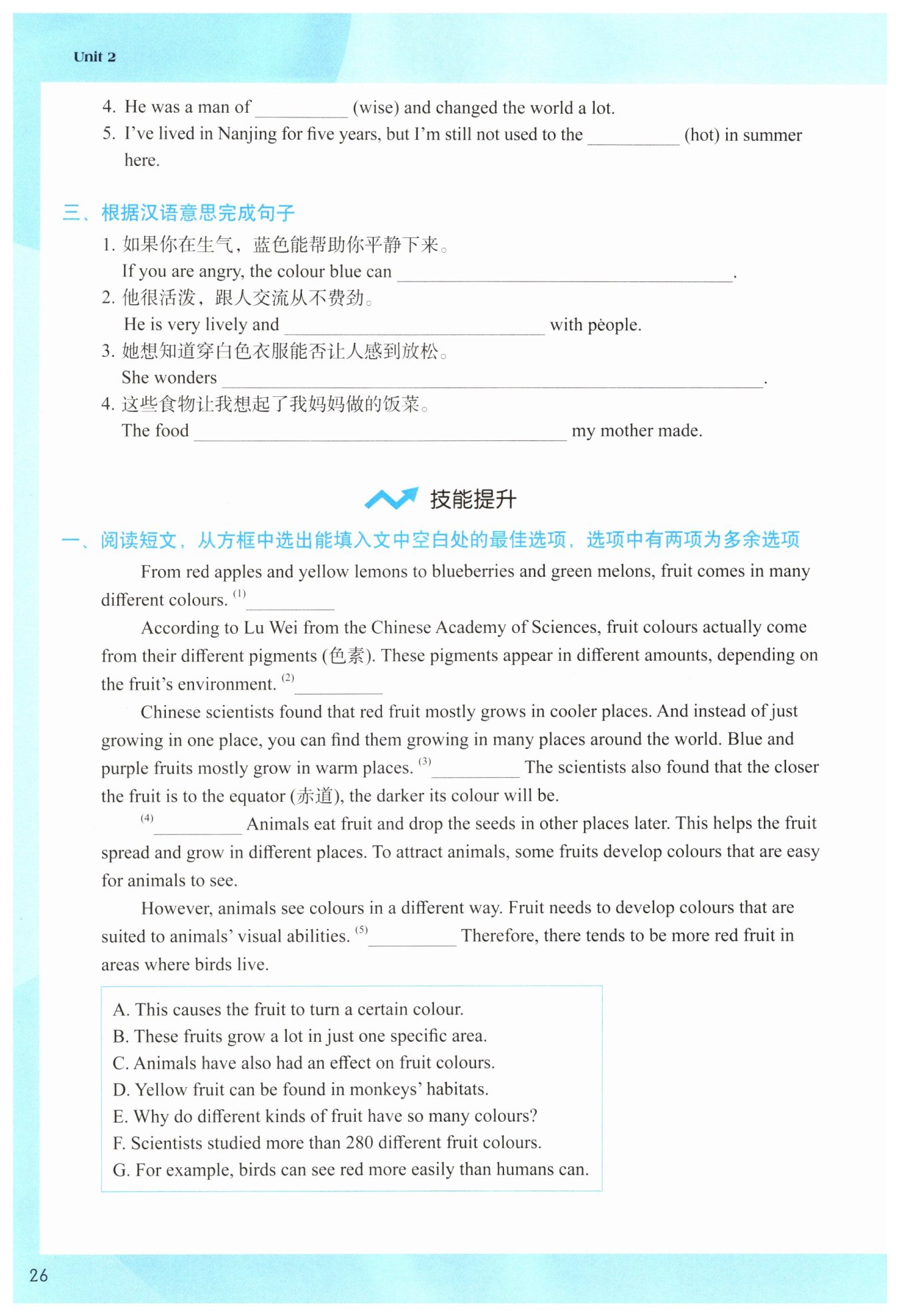 1. 根據(jù)第一段,文章開頭提到水果有多種顏色,接著需要引出“為什么水果有這么多顏色”的問題。選項E“為什么不同種類的水果有這么多顏色?”正好承上啟下,符合此處語境。 2. 第二段提到水果顏色由色素決定,且色素含量受環(huán)境影響。選項A“這導(dǎo)致水果呈現(xiàn)某種顏色”可以自然銜接前文,解釋色素變化如何影響顏色。 3. 前文提到藍(lán)紫色水果多生長在溫暖地區(qū),后文需補(bǔ)充說明這些水果的分布特點。選項B“這些水果只在一個特定區(qū)域大量生長”與“藍(lán)紫色水果多在溫暖地區(qū)”相呼應(yīng),符合邏輯。 4. 本段需引出動物對水果顏色的影響。選項C“動物也對水果顏色有影響”引出后文“動物吃果后傳播種子”,符合段落主旨。 5. 最后一段需舉例說明動物視覺差異如何影響水果顏色。選項G“例如,鳥比人更容易看到紅色”與“鳥類棲息區(qū)多紅果”相呼應(yīng),符合上下文。