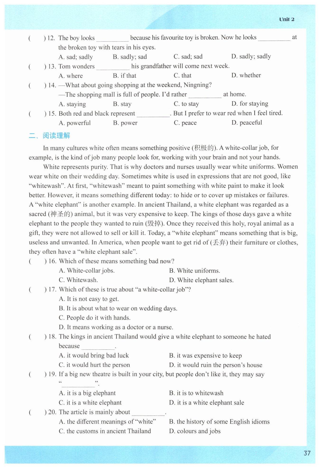 1. 細節(jié)題。由第二段第五六句 “At first, "whitewash" meant to paint something with white paint to make it look better. However, it means something different today: to hide or to cover up mistakes or failures.” 可知C是正確答案。2. 細節(jié)題。由第一段 “A white-collar job, for example,is the kind of job many people look for, working with your brain and not your hands.” 可知C不正確,而B和D完全與題干無關(guān)。所以選A。3. 細節(jié)題。由第二段 “... but it was very expensive to keep. The kings of those days gave a white elephant to the people they wanted to ruin(毀掉). ” 可知選B。4. 由 “Today, a "white elephant" means something that is big, useless, and unwanted. ” 可知,“不被人們喜歡的電影院”可以被稱作 “a white elephant“,選C。5. 主旨題。結(jié)合文意可知,文章分別講述了 ”white“ 在不同情況下的不同含義,所以選A。