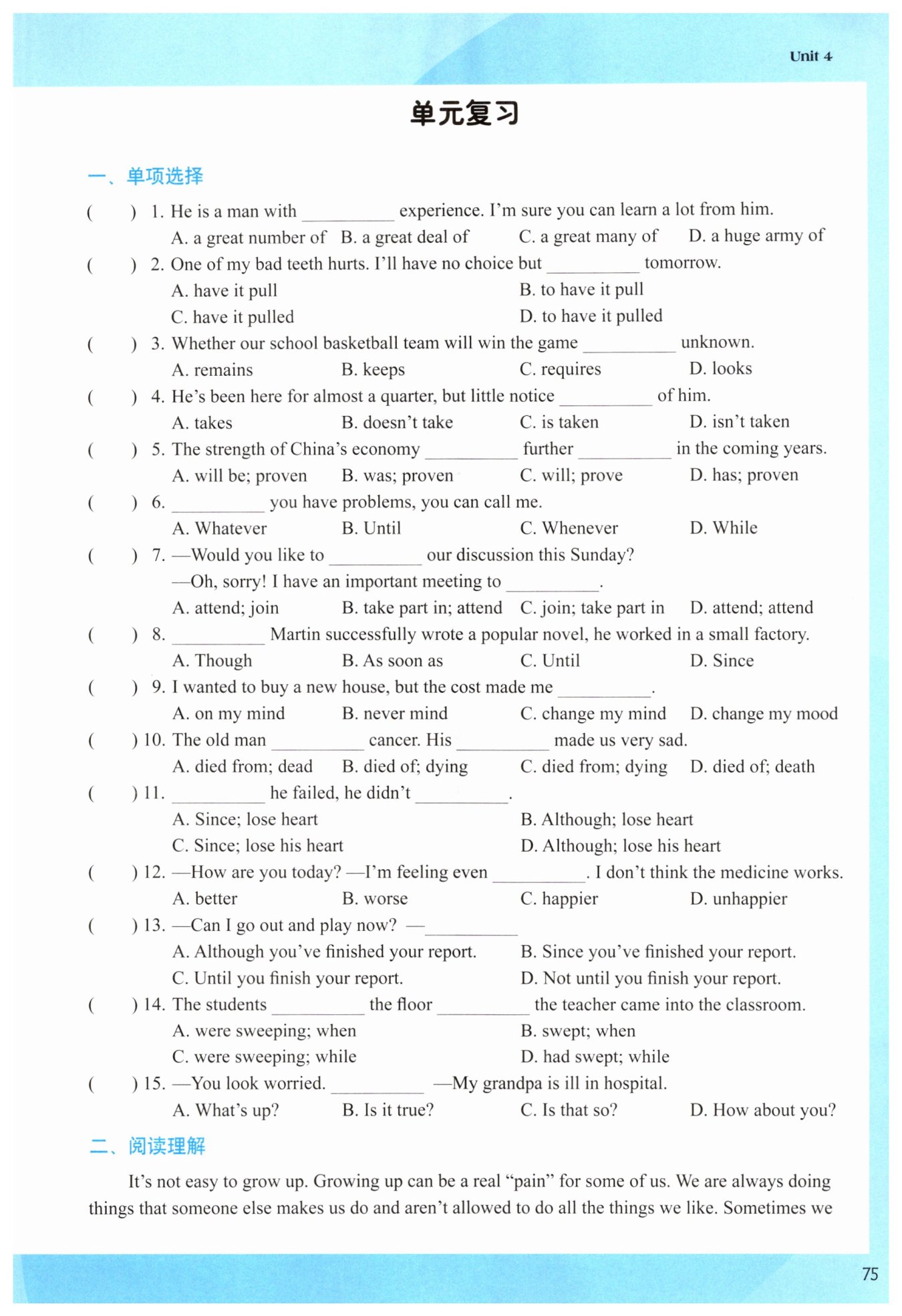 【解析】:這是一道英語(yǔ)選擇題,考查的是對(duì)短語(yǔ)辨析和語(yǔ)境理解的能力。題目中給出了四個(gè)選項(xiàng),都是表示“大量”的短語(yǔ),但用法和修飾的對(duì)象有所不同。A選項(xiàng)“a great number of”通常修飾可數(shù)名詞復(fù)數(shù);C選項(xiàng)“a great many of”通常也修飾可數(shù)名詞復(fù)數(shù),且前面通常要有定冠詞或指示代詞等限定詞;D選項(xiàng)“a huge army of”通常修飾人,表示“一大群人”;而B(niǎo)選項(xiàng)“a great deal of”則修飾不可數(shù)名詞。在本題中,空后的“experience”是不可數(shù)名詞,表示“經(jīng)驗(yàn)”,因此應(yīng)選B。