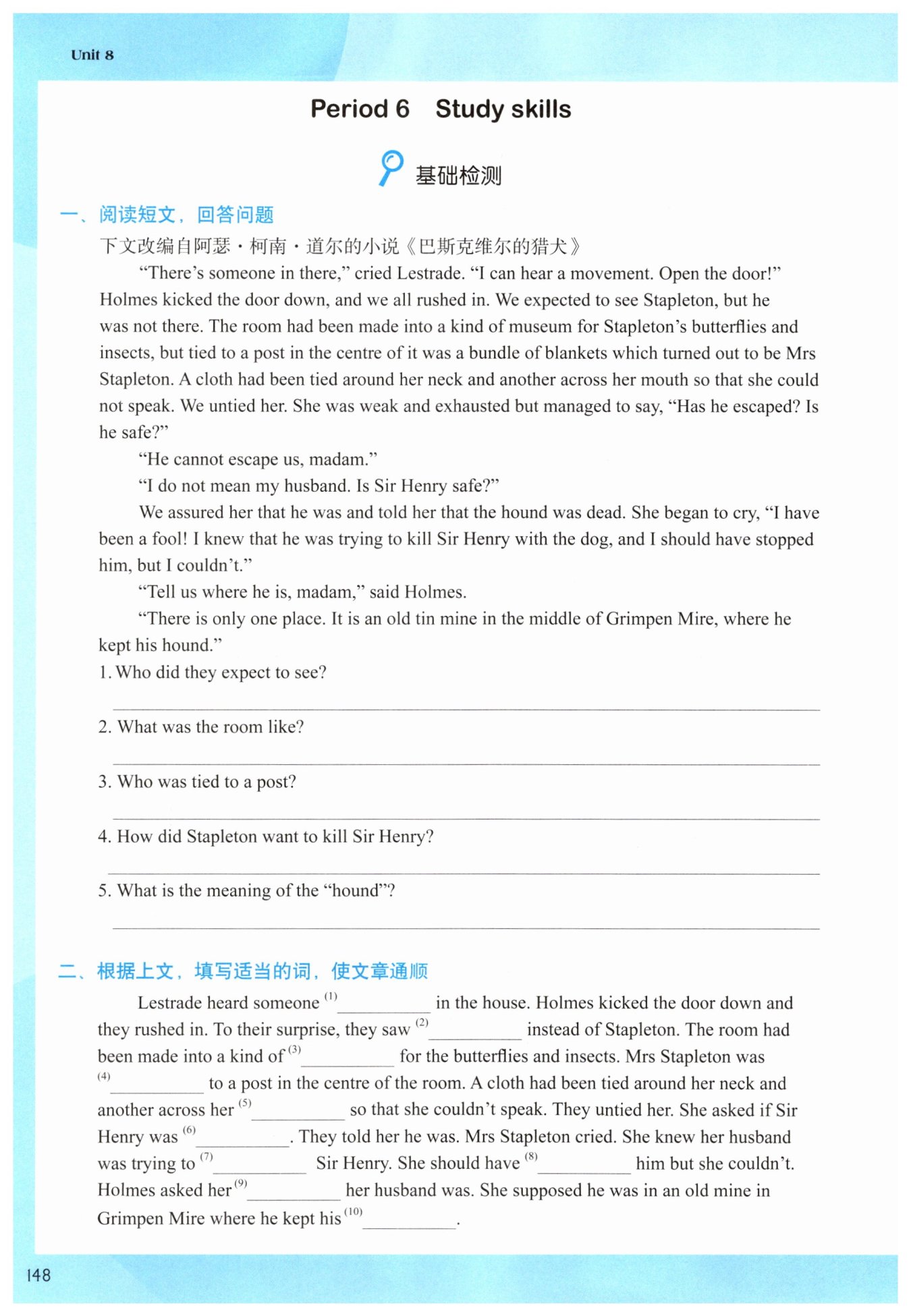1. moving 2. Mrs. Stapleton 3. museum 4. tied 5. mouth