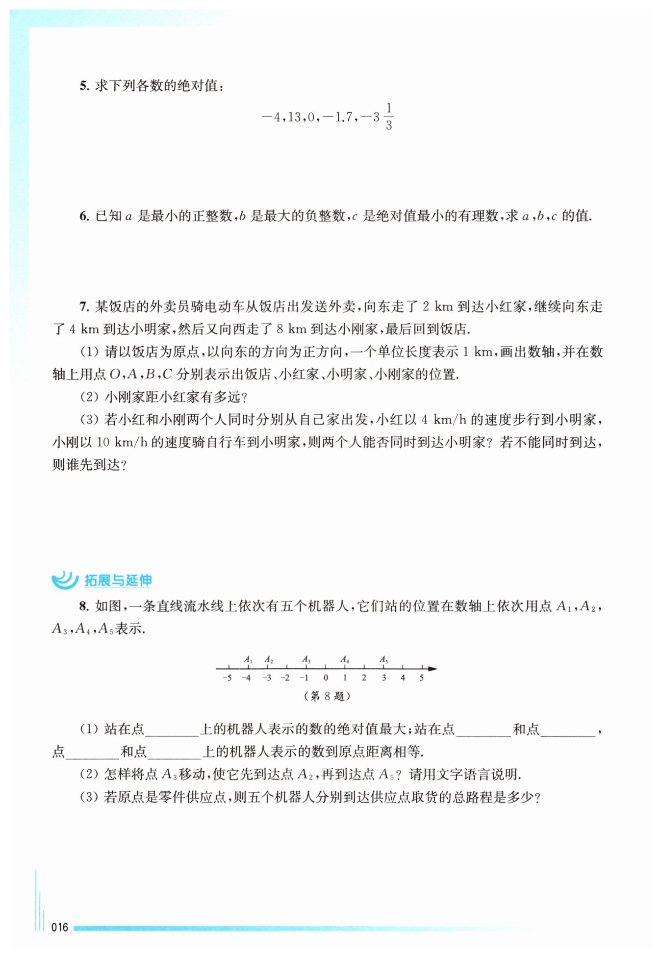 小剛到小明家距離:?$6 - (-2) = 8\ \mathrm {km},$?時(shí)間:?$8 ÷ 10 = 0.8\ \mathrm {h}。$?