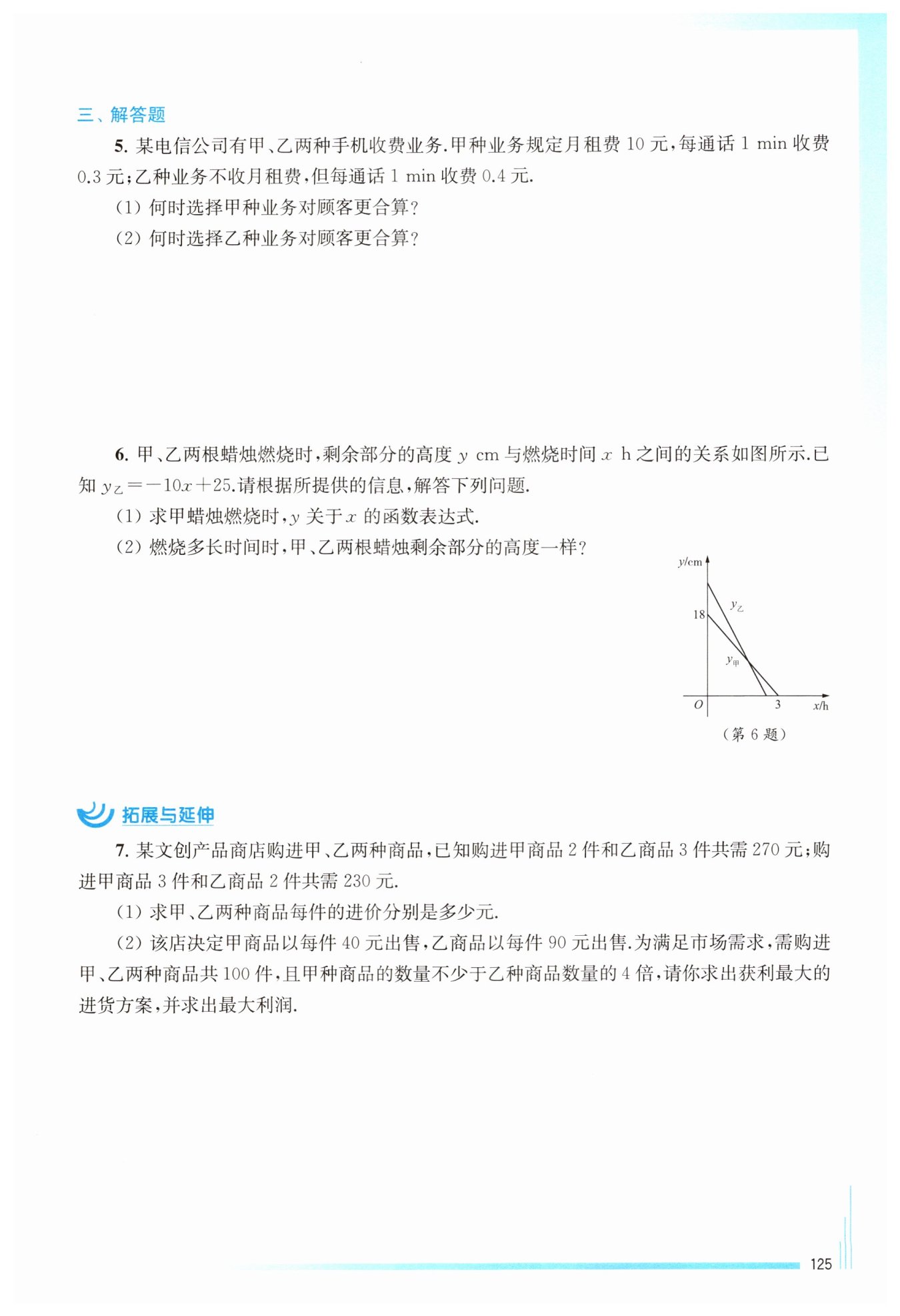 ∵甲種業(yè)務(wù)規(guī)定月租費(fèi)?$10$?元,每通話?$1 \mathrm {\mathrm {min}}$?收費(fèi)?$0.3$?元,∴?$y_{甲}=10+0.3x$?