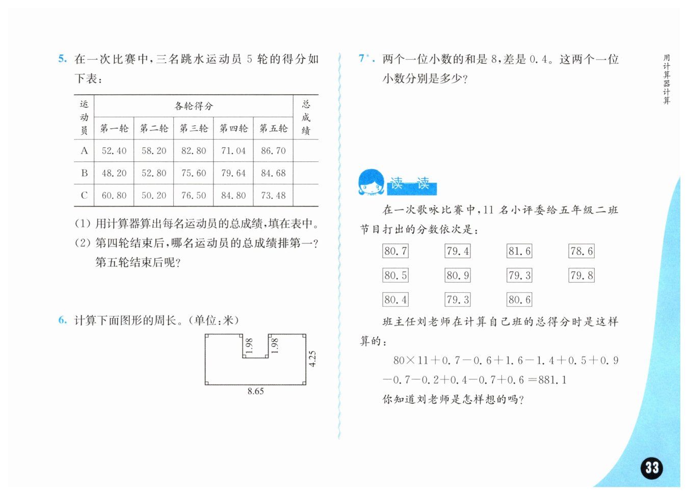 劉老師將每個(gè)評(píng)委的分?jǐn)?shù)都看作80分,先算11個(gè)80分的總和80×11=880分,再將每個(gè)分?jǐn)?shù)與80分的差值相加(0.7-0.6+1.6-1.4+0.5+0.9-0.7-0.2+0.4-0.7+0.6=1.1),最后用880+1.1=881.1分,這樣計(jì)算更簡便。