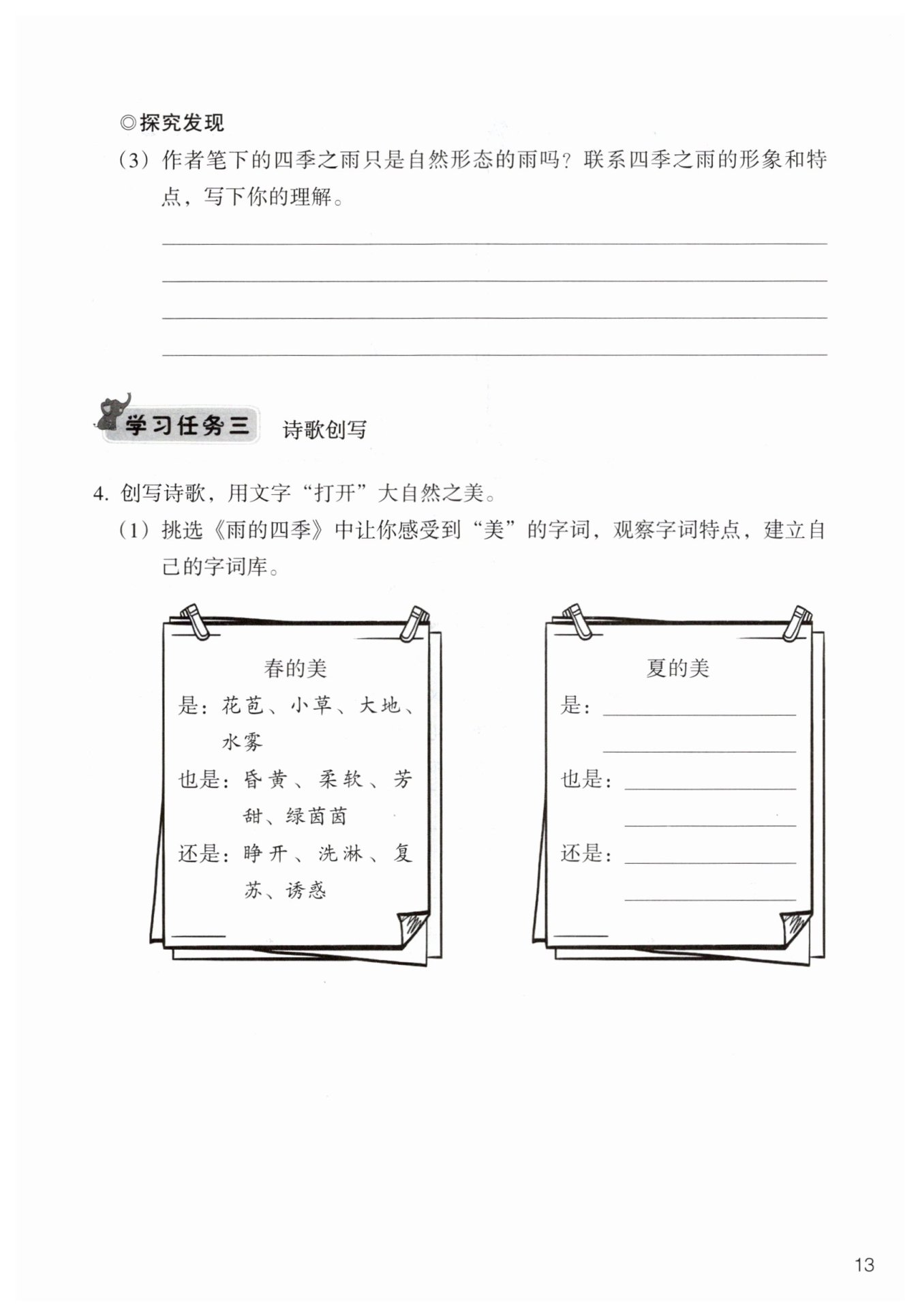 段和狀態(tài)。作者感知到萬(wàn)事萬(wàn)物間的聯(lián)系與影響,在四季輪轉(zhuǎn)中,景物會(huì)經(jīng)歷一系列變化和生長(zhǎng)。