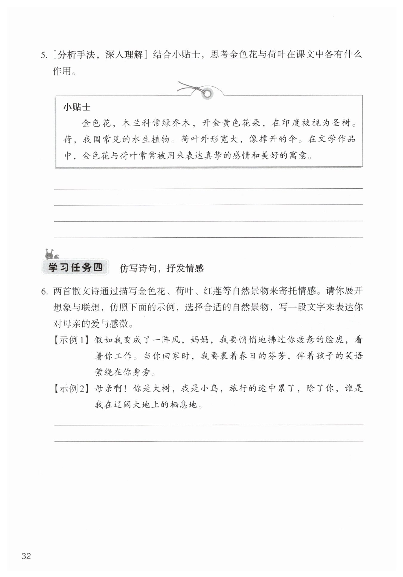 花表達(dá)母子之間偉大、純真的情感。荷葉在文中代表為兒女遮風(fēng)擋雨、無