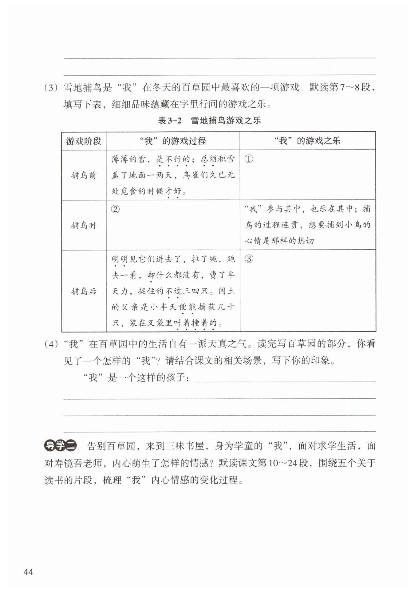 ①已從原本的陌生和不理解變?yōu)檫m應(yīng) ②一開始是恭敬的,而提問被呵斥“不知道”,“我”心中有怨憤之情 ③經(jīng)過一段時(shí)間的書塾生活,“我”能積極地投入學(xué)習(xí)中,跟上學(xué)習(xí)的節(jié)奏 ④“我”將讀書視作一種游戲,以開玩笑的心情調(diào)侃讀書這件事 ⑤朦朧地感受到讀書是一件神圣而有樂趣的事情 ⑥趁著老師投入地朗讀之際,做自己喜歡做的事情時(shí)的竊喜⑦從恐懼讀書、怨憤老師不回答問題到適應(yīng)老師、按部就班地學(xué)習(xí),雖然有些頑皮的表現(xiàn),但 已然從一個(gè)在家玩耍的學(xué)齡前兒童轉(zhuǎn)變?yōu)橐粋€(gè)熱愛學(xué)習(xí)、樂于參加集體生活的讀書郎