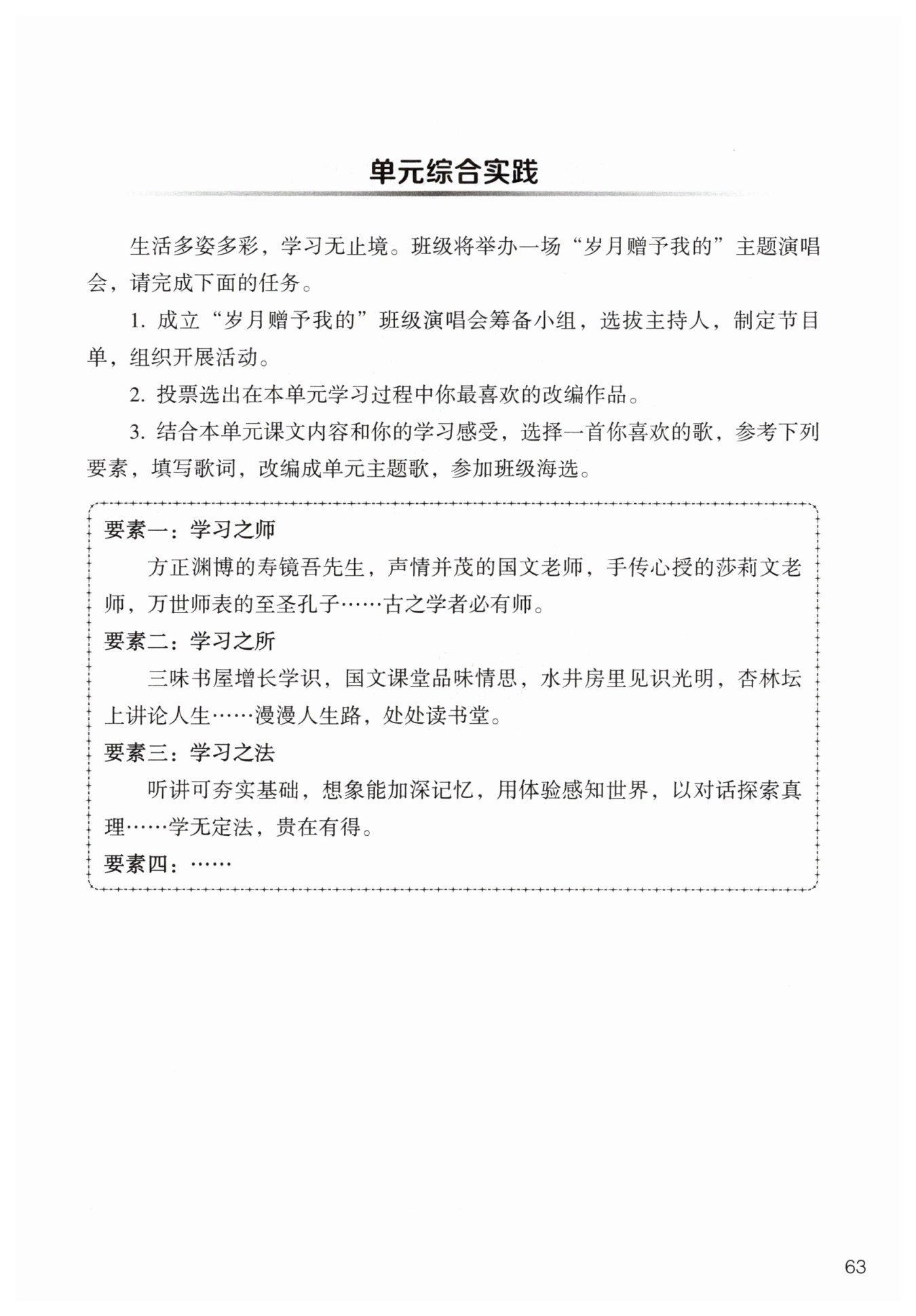 1、2根據(jù)實(shí)際作答 3. 以《童年》為例進(jìn)行歌詞改編: 《學(xué)習(xí)童年》 池塘邊的課堂里 方正淵博的壽先生在講 聲音并并茂的國文老師 手傳心授的莎莉文 還有萬世師表的孔子呀 古之學(xué)者必有師 教室里的課桌旁 三味書屋知識(shí)在長 國文課堂情味品嘗 水井房里光明見 杏林壇上人生論呀 漫漫人生路讀書堂 聽講能把基礎(chǔ)夯 想象加深記憶強(qiáng) 體驗(yàn)感知世界廣 對(duì)話探索真理亮 學(xué)無定法貴有得呀 學(xué)習(xí)之路長又長