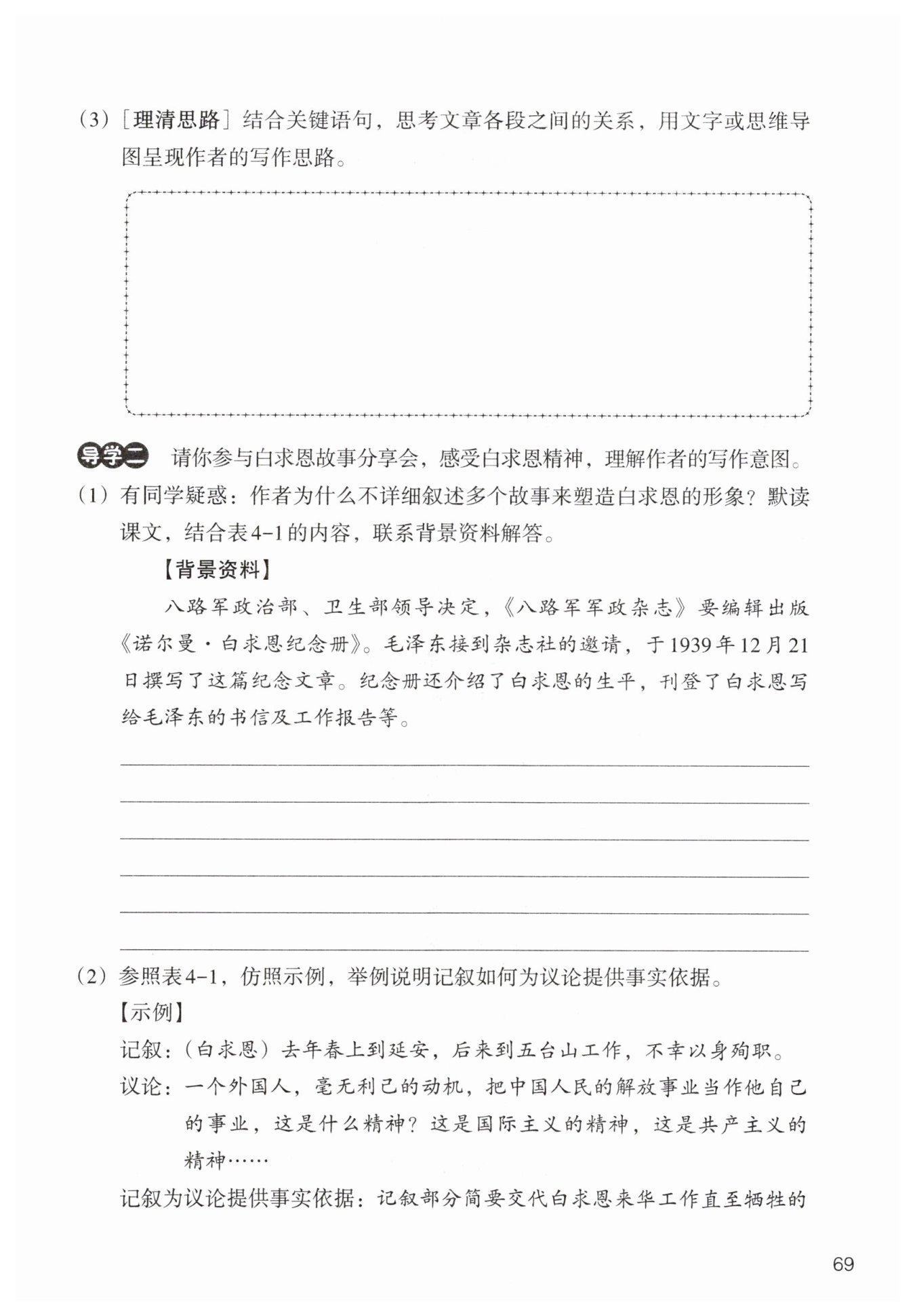 題,發(fā)起向白求恩學(xué)習(xí)的號(hào)召。第2段中,作者也提到了“從前線回來的人”“晉察冀邊區(qū)的軍民”都清楚白求恩事跡,被他的精神所感動(dòng);從背景資料中可知《諾爾曼·白求恩紀(jì)念冊(cè)》還介紹了白求恩的生平,刊登了白求恩寫給毛澤東的書信及工作報(bào)告等。綜上所述,白求恩的事跡無須贅述。