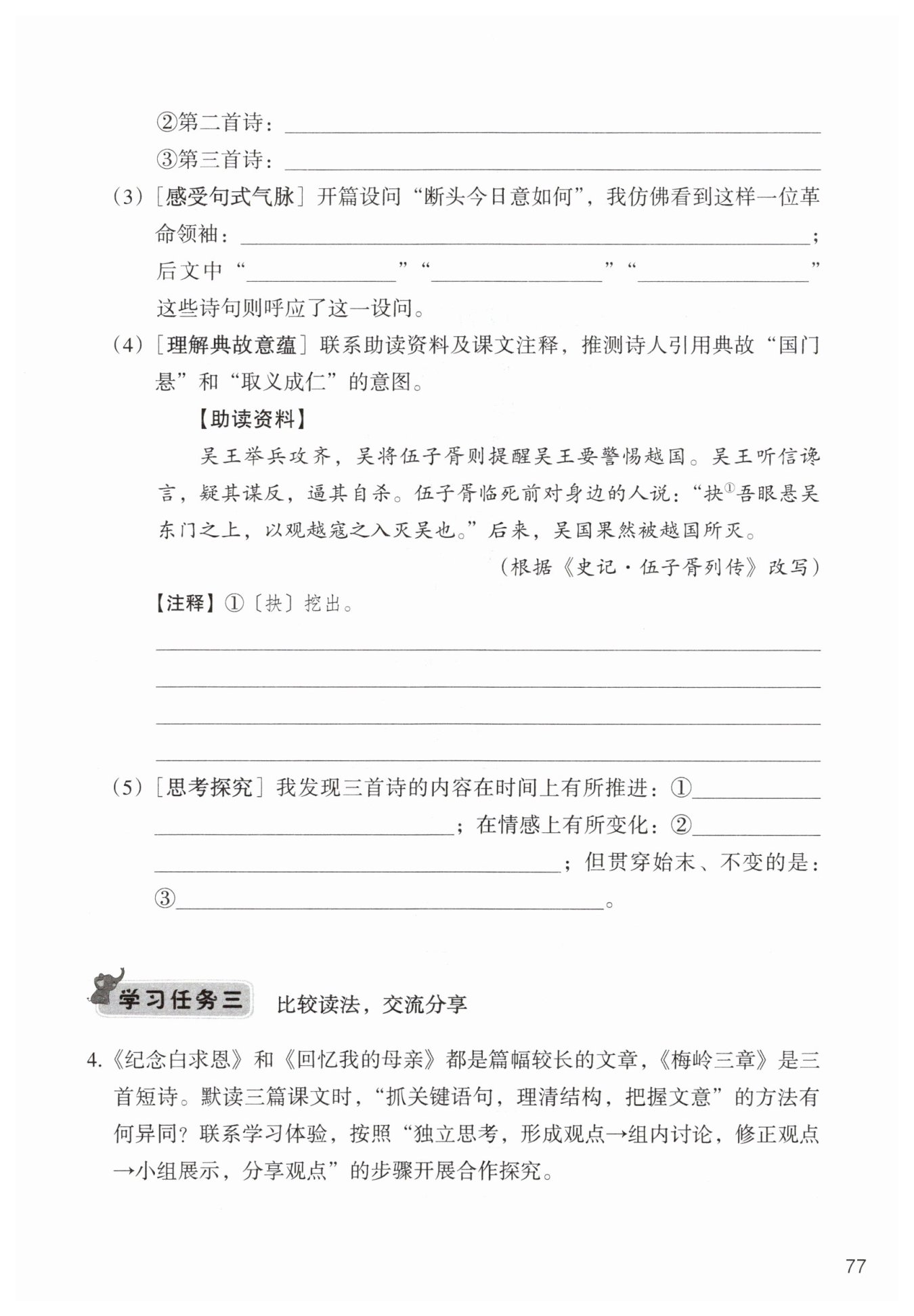 2. 都要理清結(jié)構(gòu)。《紀(jì)念白求恩》是議論文結(jié)構(gòu),先提出論點(diǎn),再?gòu)牟煌矫嬲撟C;《回憶我的母親》是回憶性散文結(jié)構(gòu),以時(shí)間為線索組織材料;《梅嶺三章》是詩(shī)歌結(jié)構(gòu),每一章有其相對(duì)獨(dú)立又相互關(guān)聯(lián)的內(nèi)容。通過(guò)理清結(jié)構(gòu),能更好地把握文意。