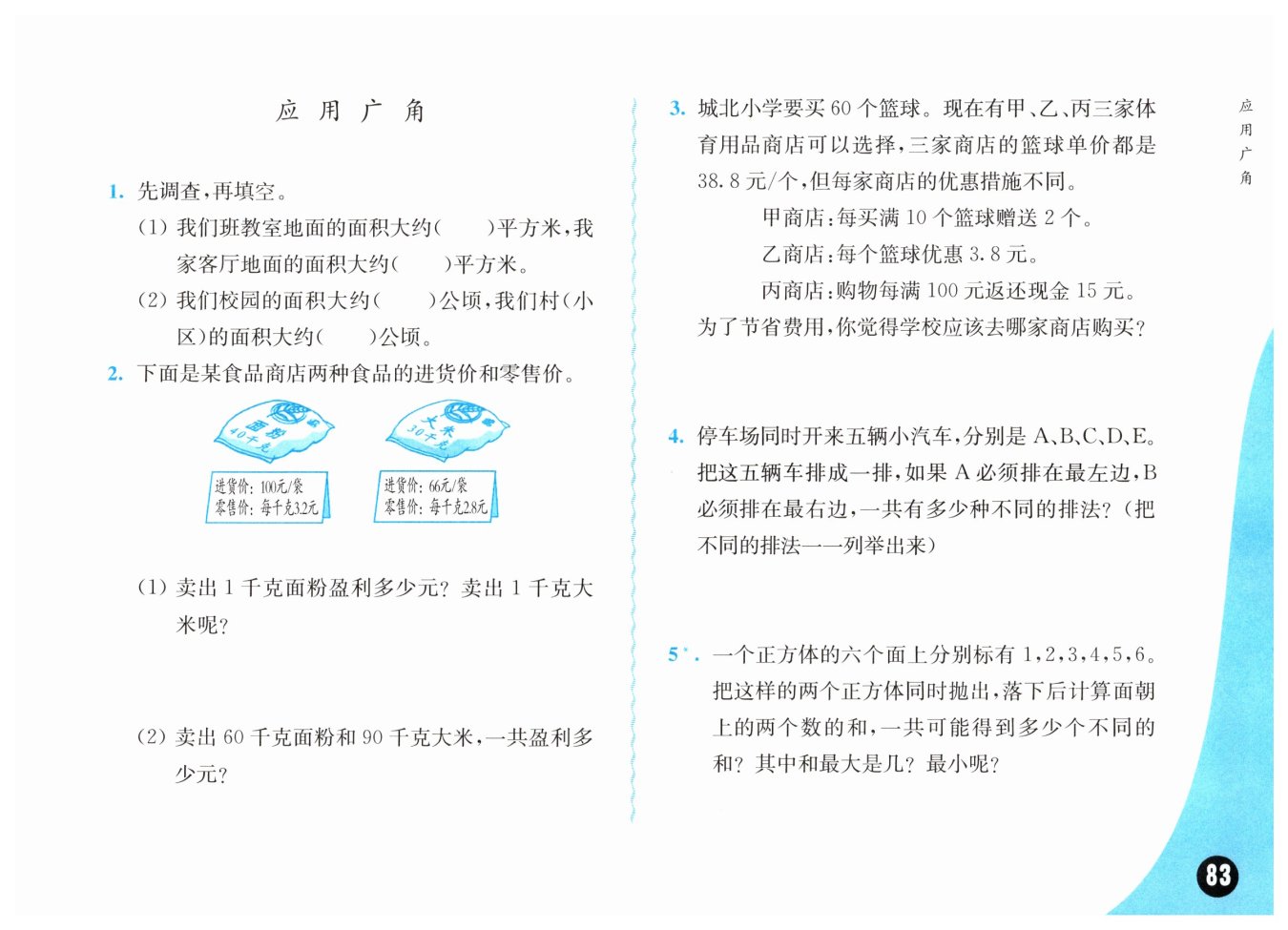 在甲商店買10個籃球,可得12個籃球,60÷12=5,所以只要買10×5=50(個)籃球,一共要用38.8×50=1940(元);乙商店每個籃球的實際售價是38.8 - 3.8=35(元),買60個籃球一共要用35×60=2100(元);在丙商店買60個籃球一共應(yīng)付38.8×60=2328(元),商店返還15×23=345(元),實際付2328 - 345=1983(元)。