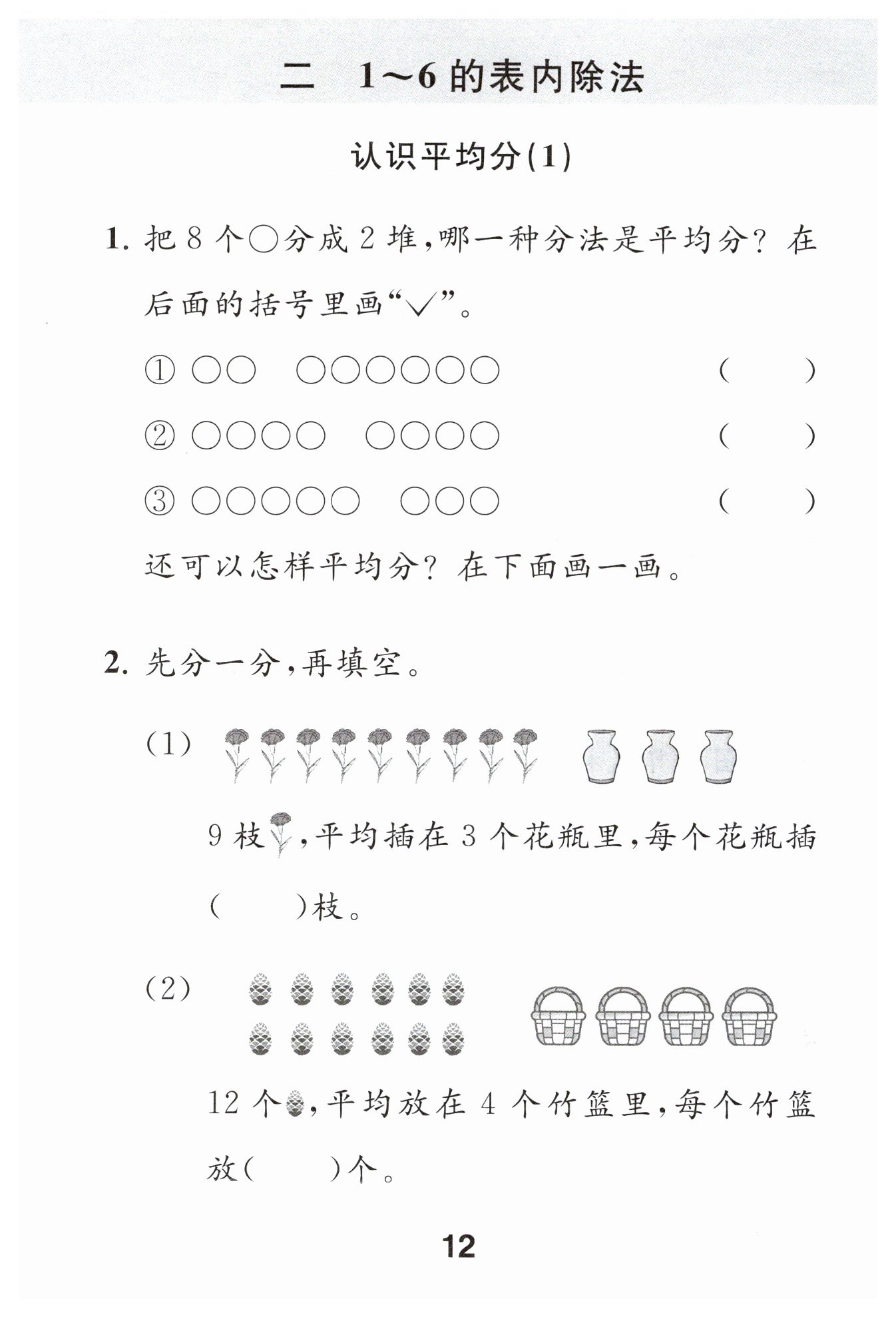 ②中兩堆圓圈的數(shù)量都是$4$個(gè),$4 = 4$,兩份數(shù)量相等,所以是平均分,括號(hào)里畫“√”。