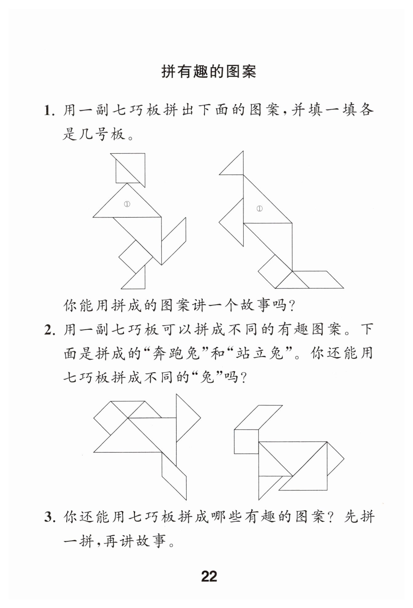 在一個美麗的森林里,左邊圖案像是一個勇敢的獵人(由七巧板拼成),他拿著用七巧板①(最大三角形)做成的“盾牌”去打獵。走著走著,遇到了右邊圖案像是一只狡猾的狐貍(由七巧板拼成),狐貍也有著用七巧板①(最大三角形)做成的“偽裝”,它們之間展開了一場奇妙的“森林奇遇”。獵人憑借著智慧和“盾牌”(七巧板①等組成的獵人形象),狐貍憑借著狡猾和“偽裝”(七巧板①等組成的狐貍形象),在森林里上演了一出有趣的故事。(故事可根據(jù)自己的想象編寫,答案不唯一)