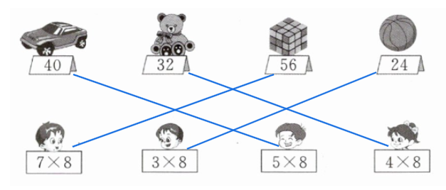 答案:連線從左到右為:$5×8$連$40$;$4×8$連$32$;$7×8$連$56$;$3×8$連$24$。