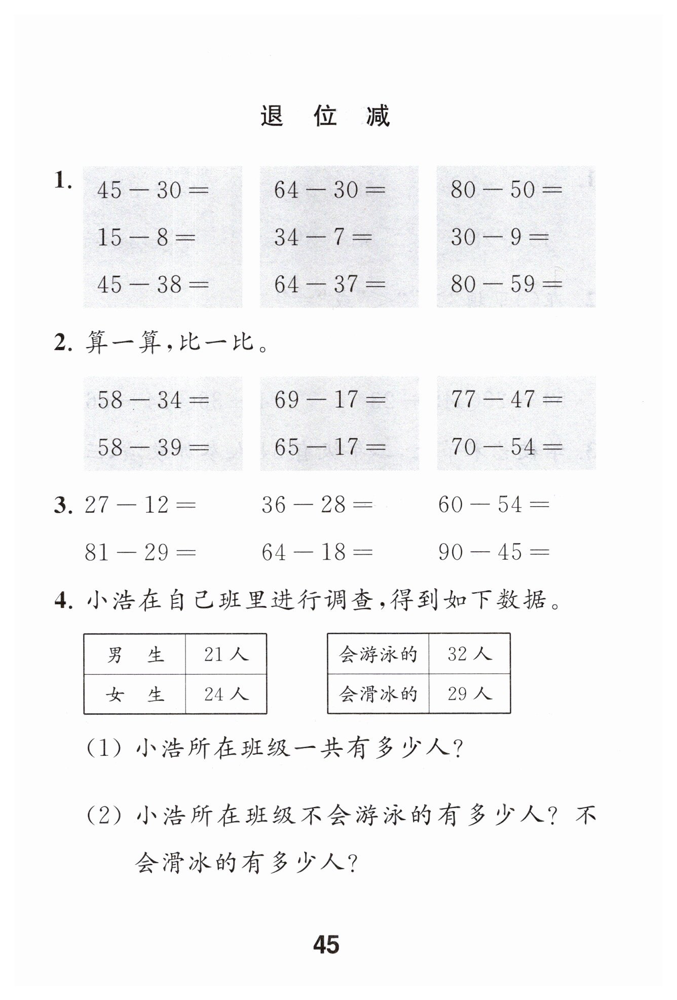 答:(1)小浩所在班級一共有$45$人;(2)小浩所在班級不會游泳的有$13$人,不會滑冰的有$16$人。