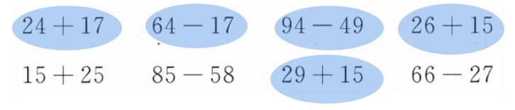 答案:圈出的算式為$24 + 17$,$64 - 17$,$94 - 49$,$26 + 15$,$29 + 15$。