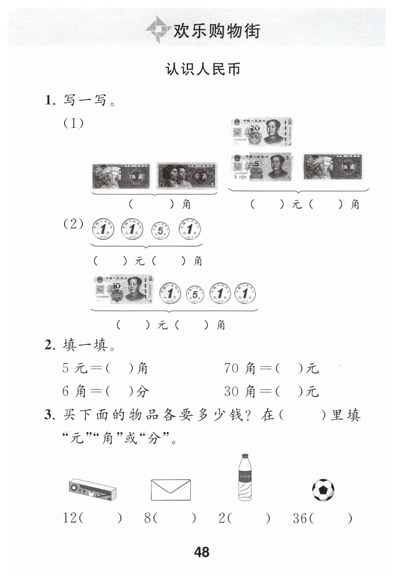 一支牙膏12元;一個(gè)信封8角;一瓶礦泉水2元;一個(gè)足球36元。