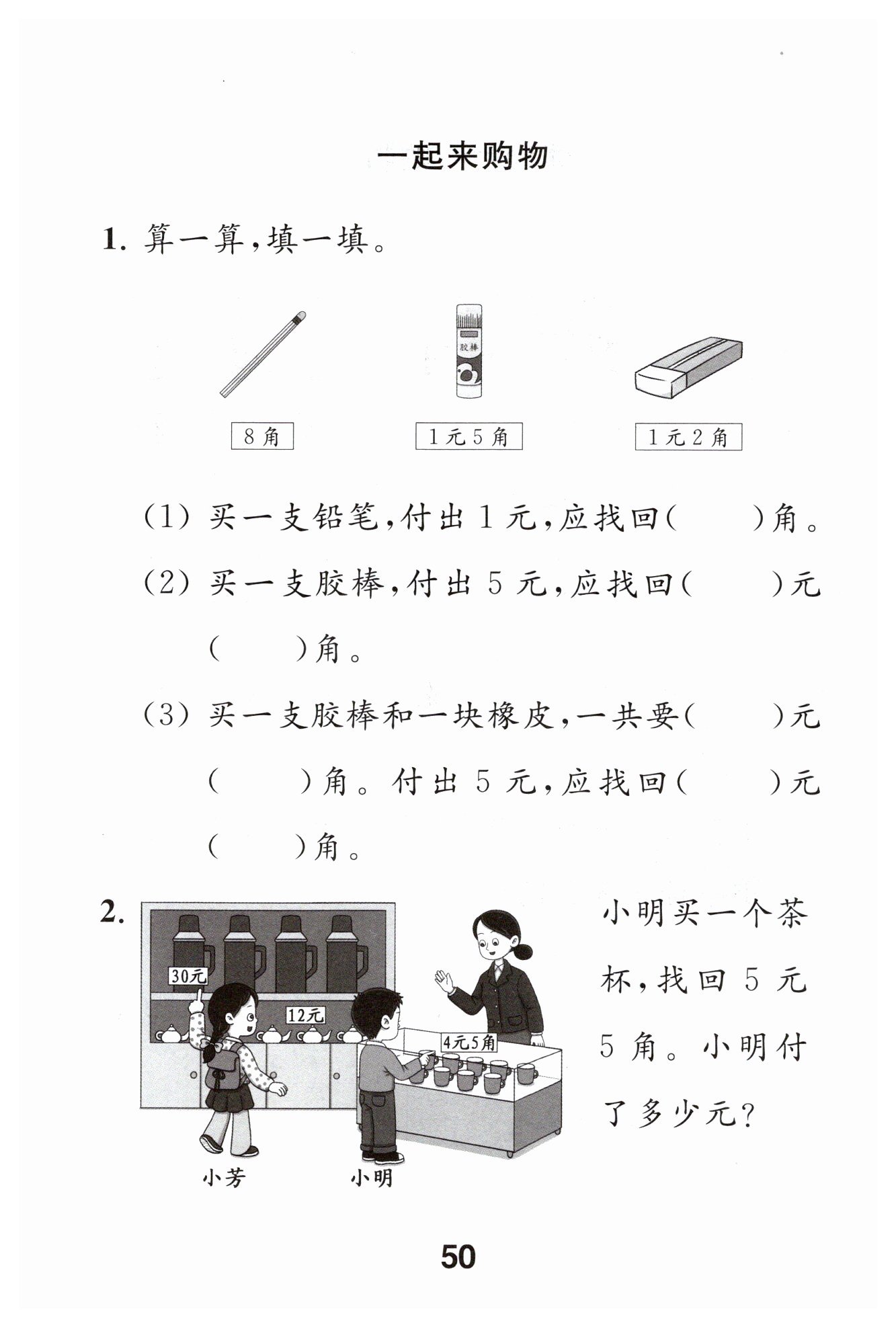 小明付的錢(qián)數(shù)等于一個(gè)茶杯的價(jià)錢(qián)加上找回的錢(qián)數(shù),將單位換算為角進(jìn)行計(jì)算,最后再將結(jié)果換算回元角的形式。