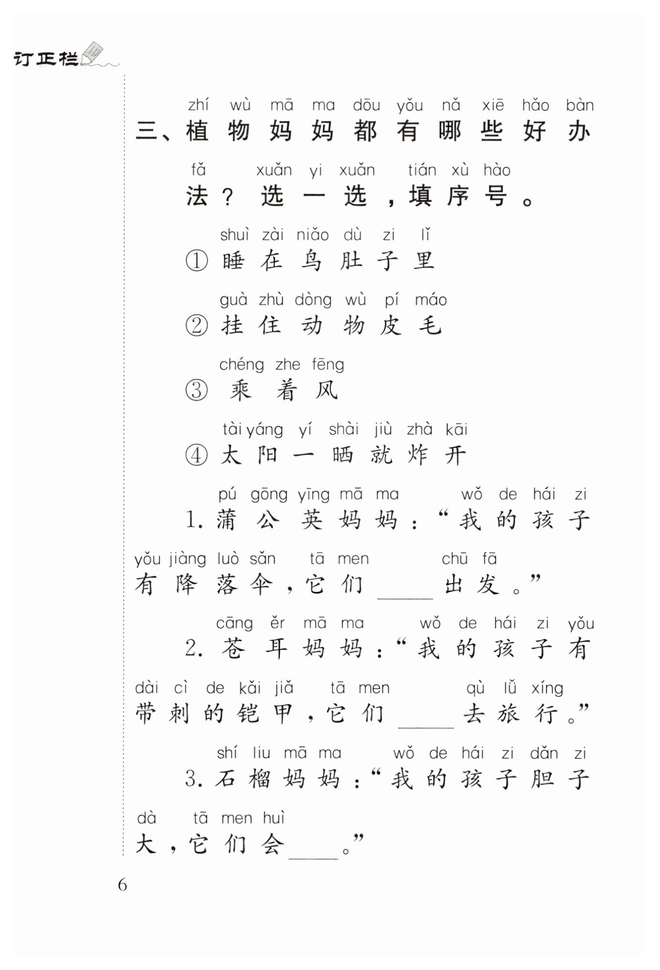 5. 柳樹媽媽:“我的孩子也喜歡______出發(fā)。” 答案:③ 乘著風(fēng)