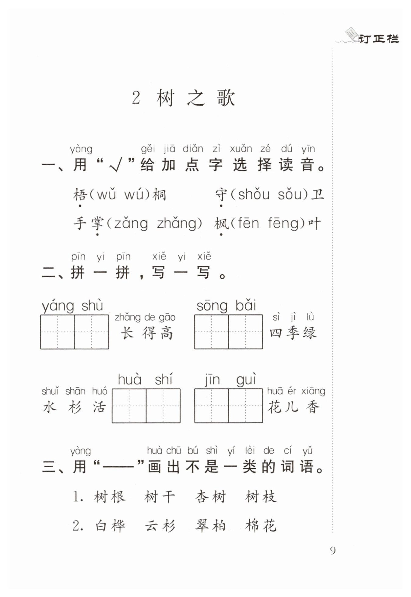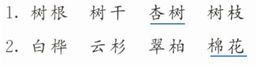 1. 對(duì)于第一組詞語(yǔ)“樹(shù)根、樹(shù)干、杏樹(shù)、樹(shù)枝”: