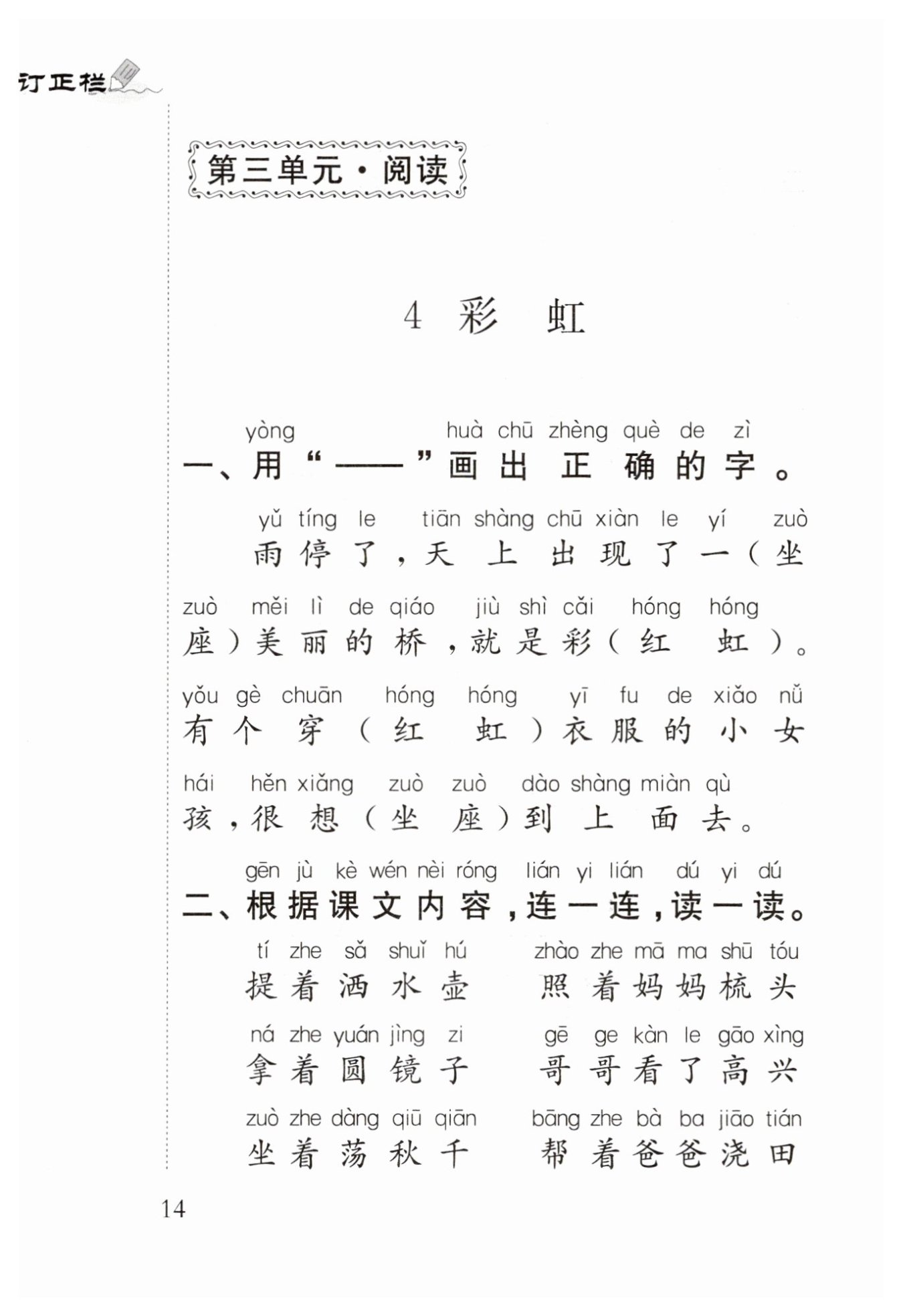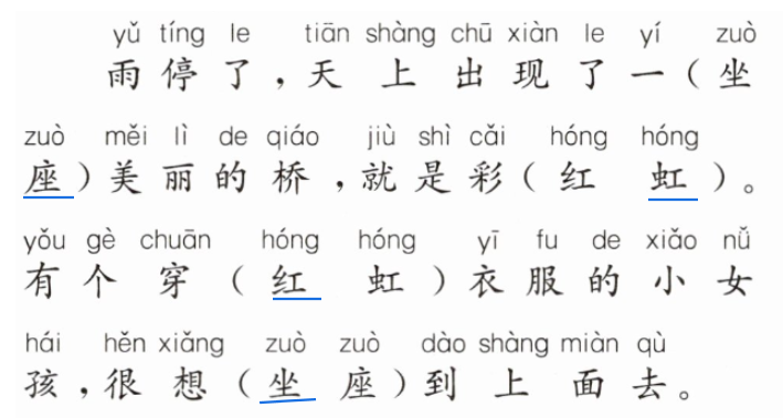 雨停了,天上出現(xiàn)了一$\underline{座}$美麗的橋,就是彩$\underline{虹}$。有個(gè)穿$\underline{紅}$衣服的小女孩,很想$\underline{坐}$到上面去。