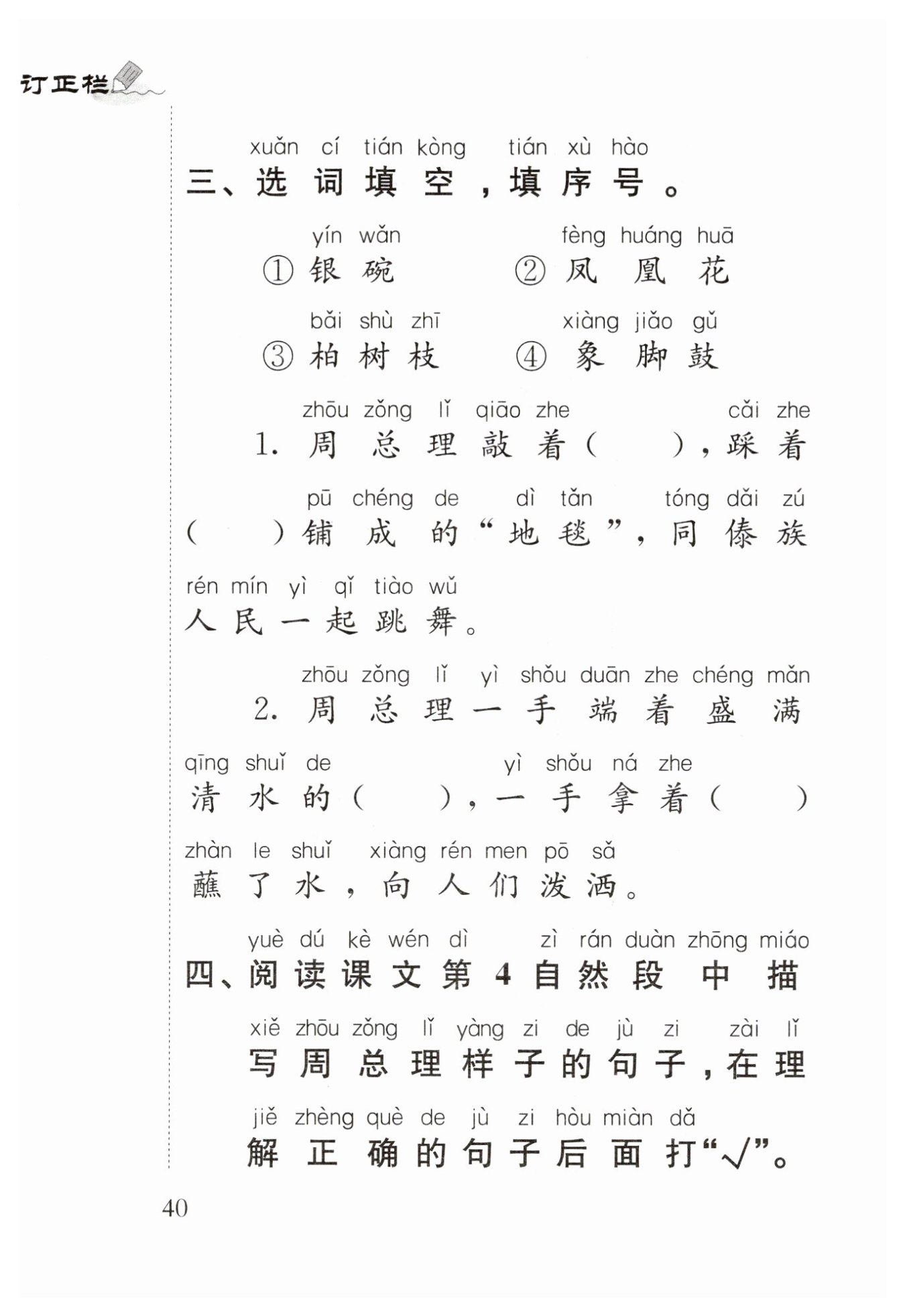 1. 周總理敲著(④象腳鼓),踩著(②鳳凰花)鋪成的“地毯”,同傣族人民一起跳舞。
