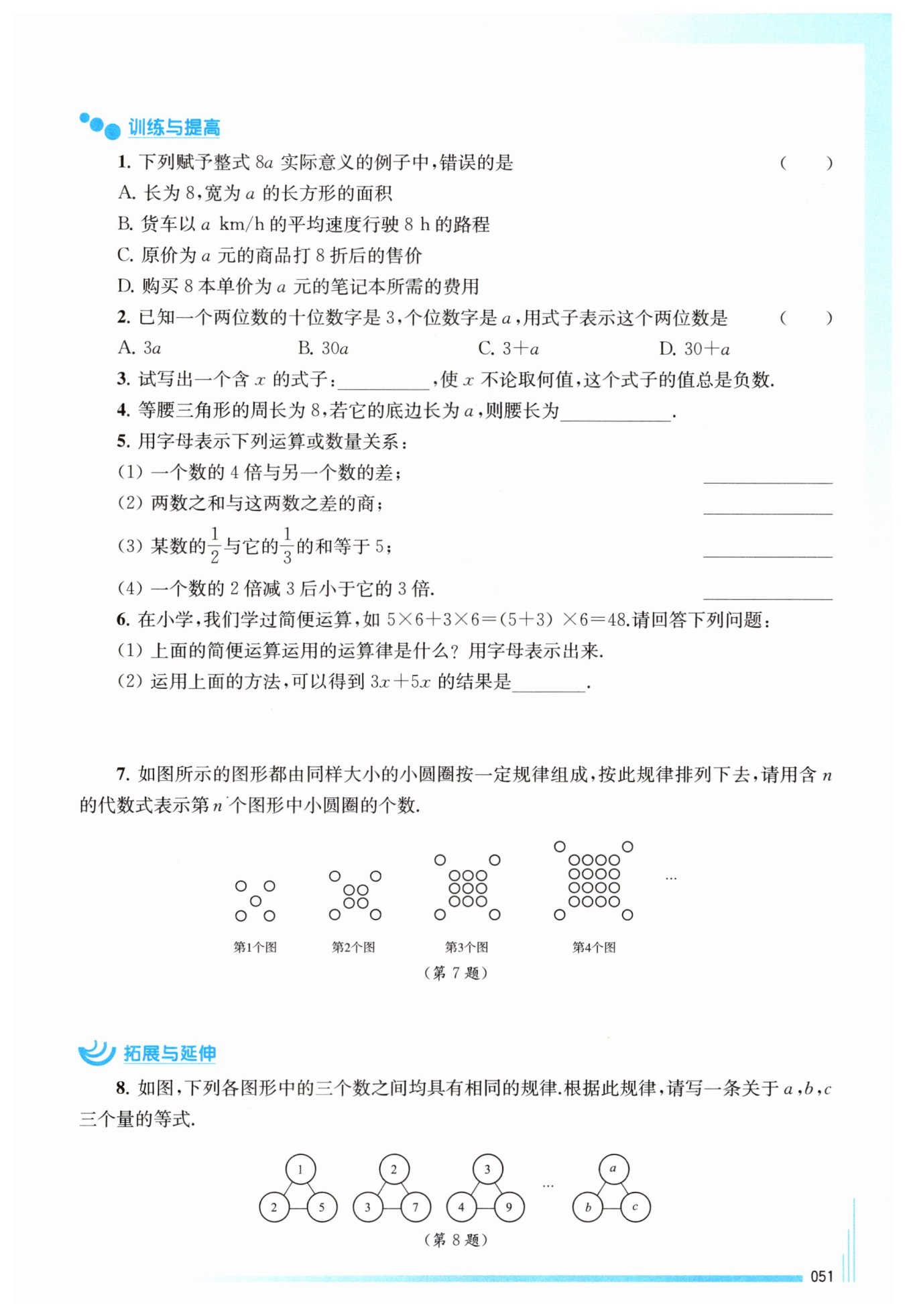 D選項(xiàng)表示購買筆記本的費(fèi)用,單價(jià)為$a$元,購買數(shù)量為8本,根據(jù)費(fèi)用公式:費(fèi)用=單價(jià)$×$數(shù)量,即$a × 8 = 8a$,與整式$8a$相符,所以D選項(xiàng)正確。