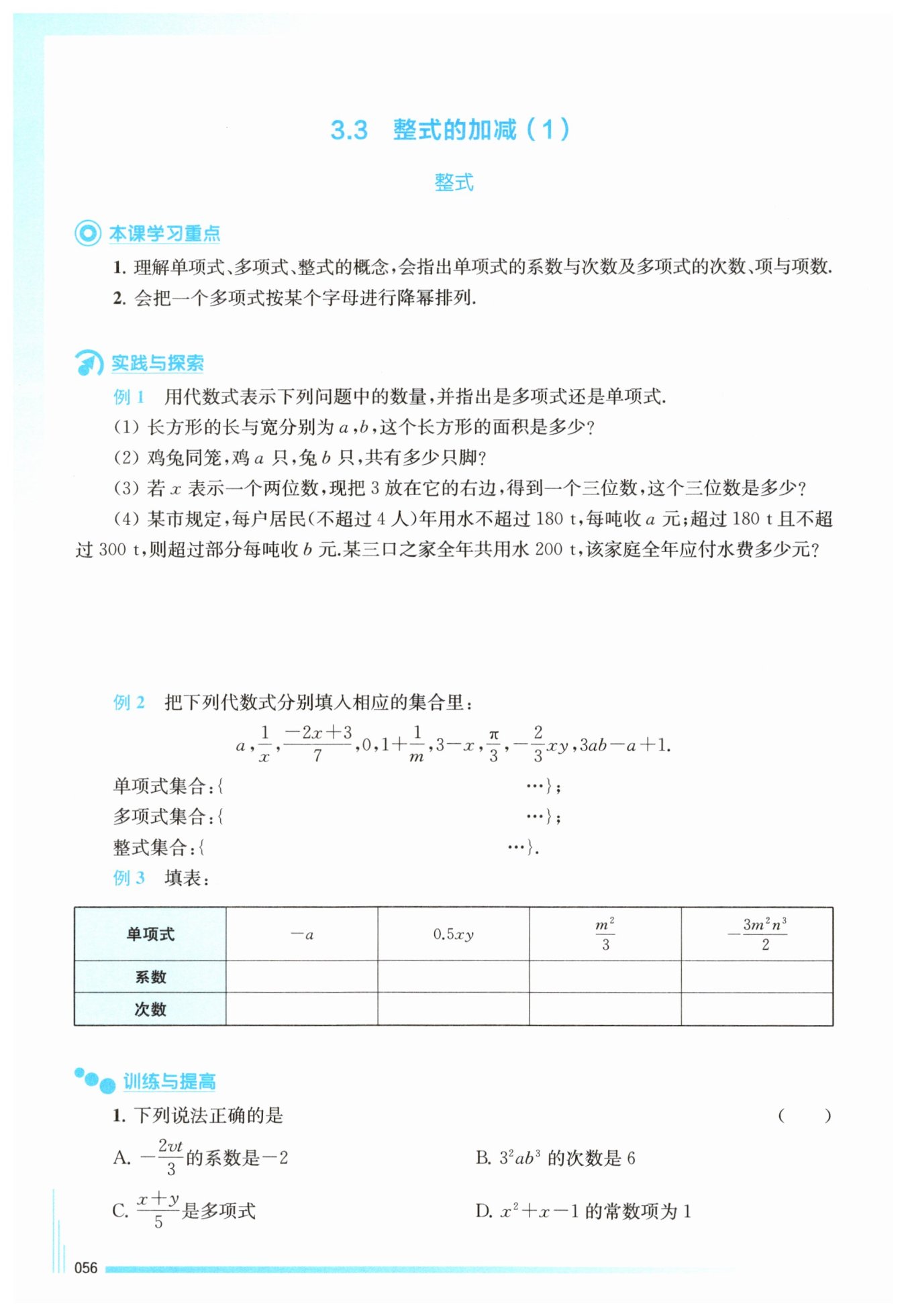 A選項:考察單項式的系數(shù)。單項式中的數(shù)字因數(shù)叫做單項式的系數(shù)。在$-\frac{2vt}{3}$中,數(shù)字因數(shù)是$-\frac{2}{3}$,而非$-2$,所以A選項錯誤。