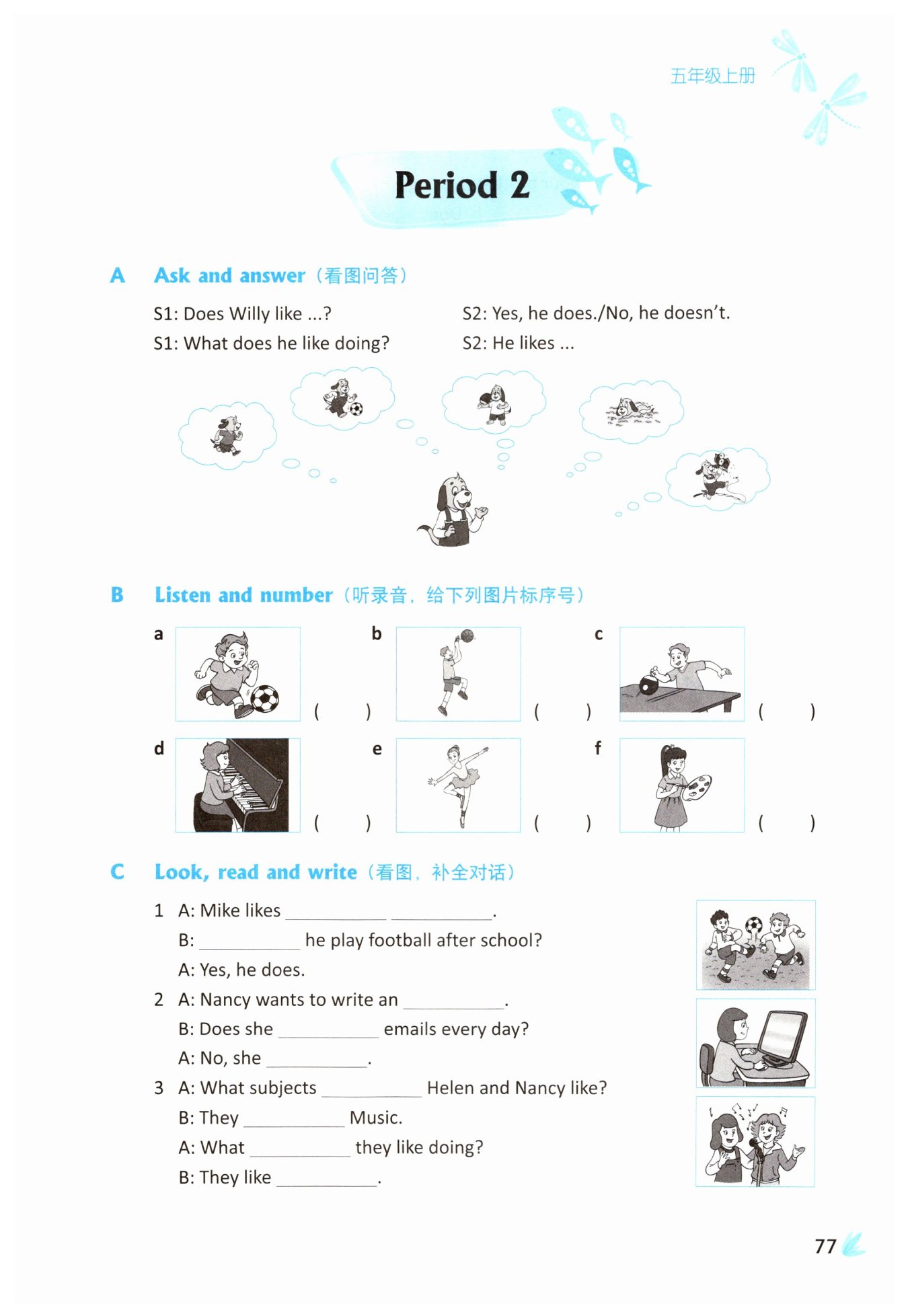 1 playing football, Does;2 email, write, doesn't;3 do, like, do, singing